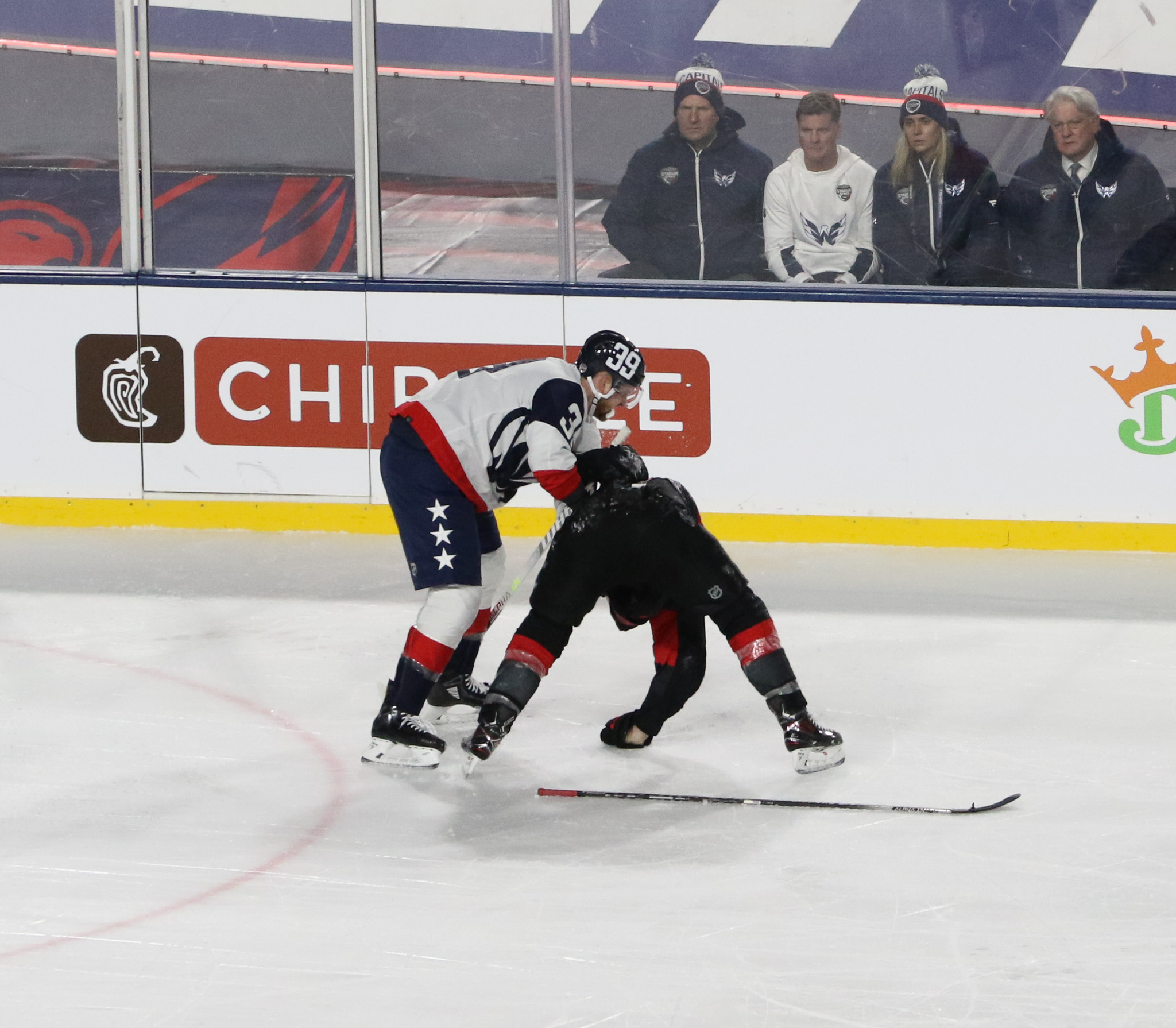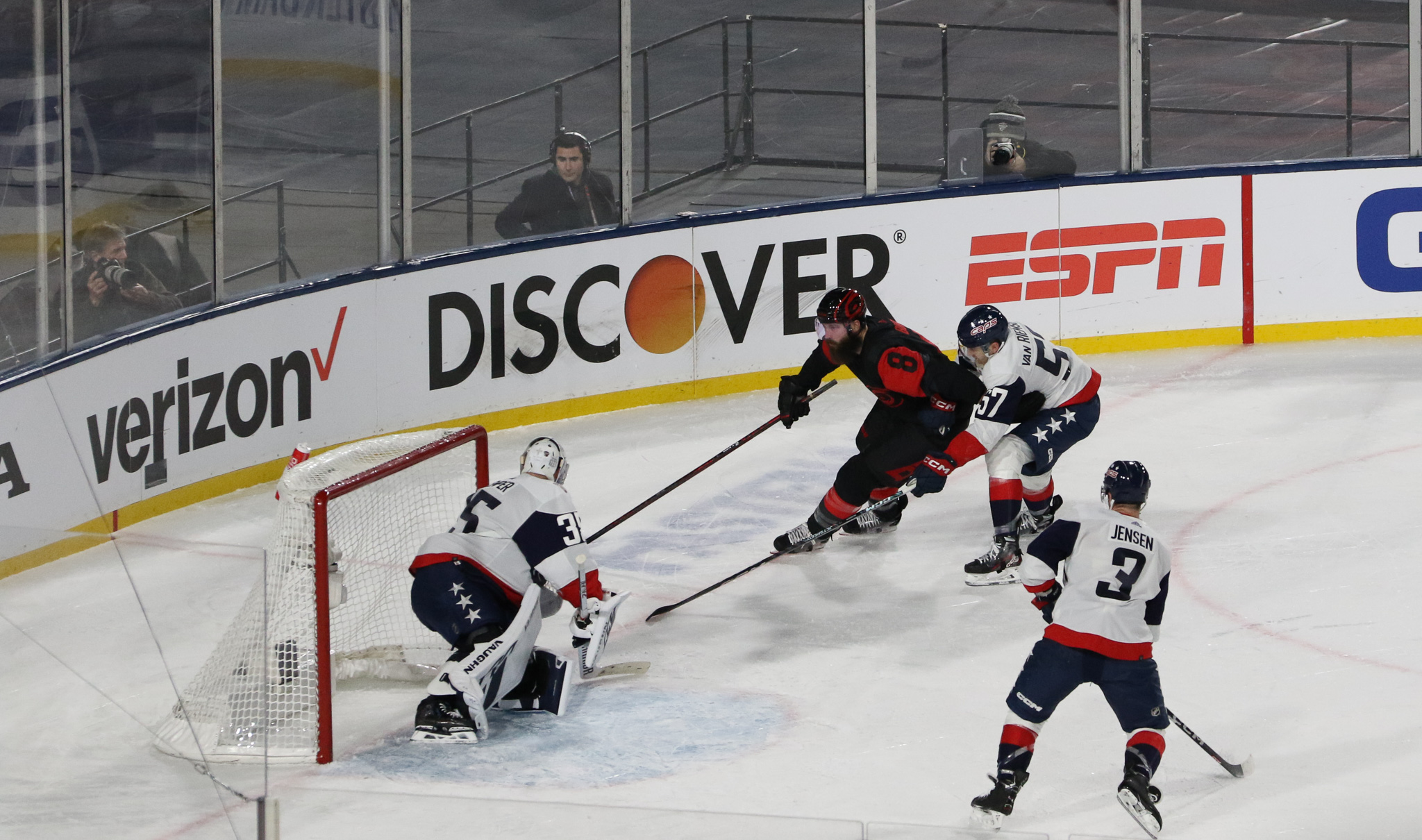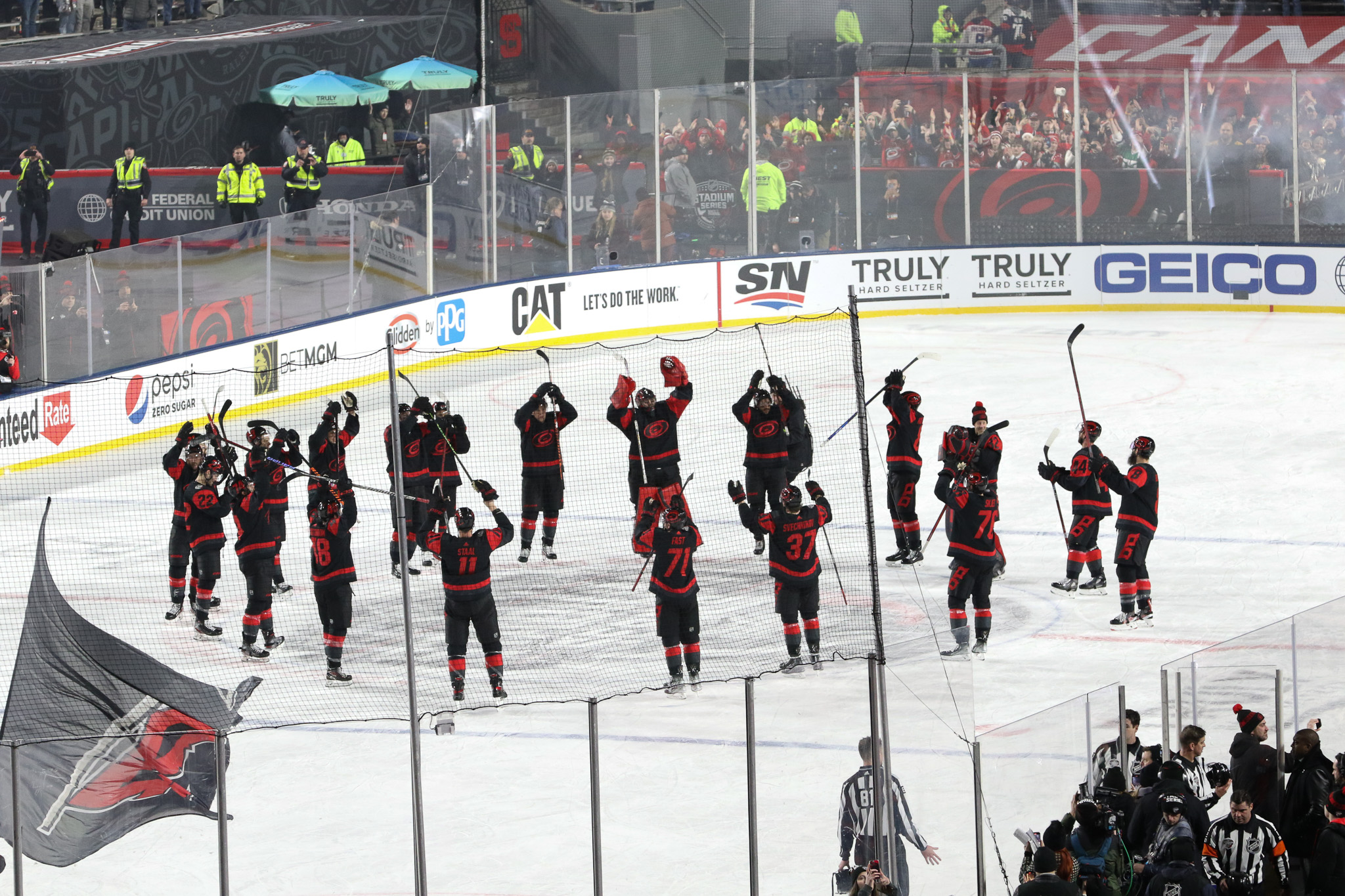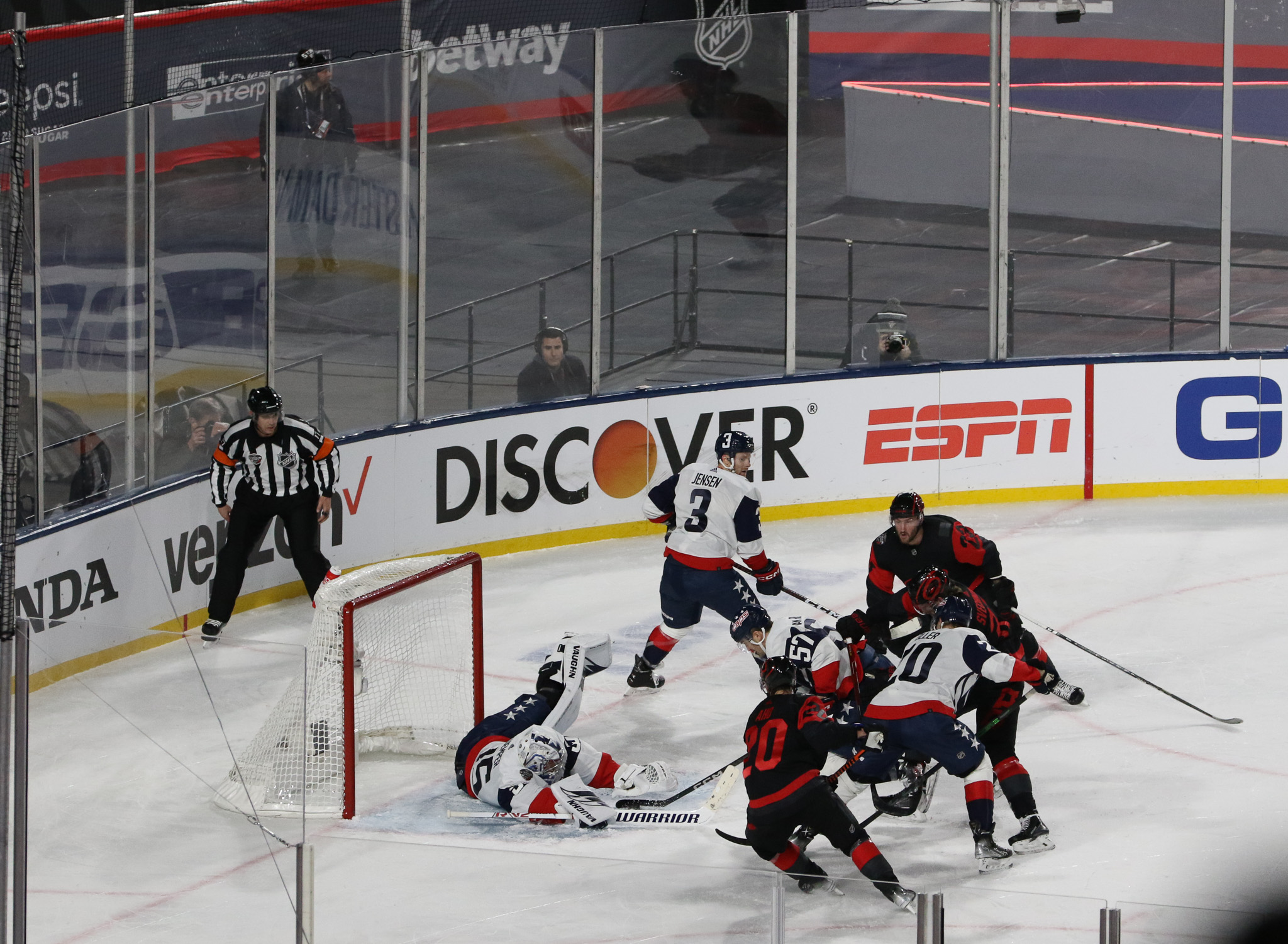 Goaltenders Frederik Andersen, a veteran of several outdoor games defended the net for Carolina at the south end while 2022 Stanley Cup champion Darcy Kuemper defended the north end, another regular season game in his maiden campaign with the Capitals.