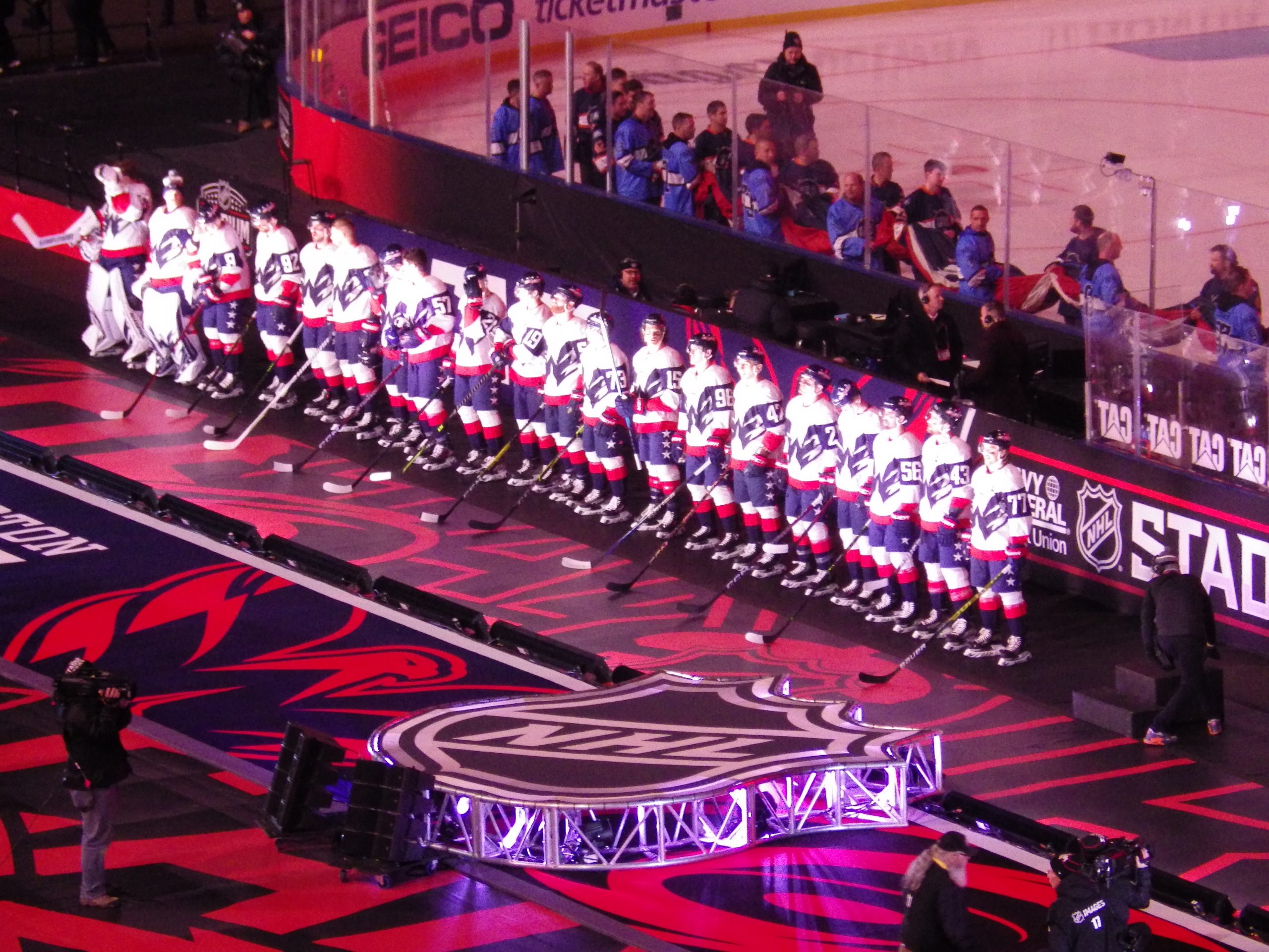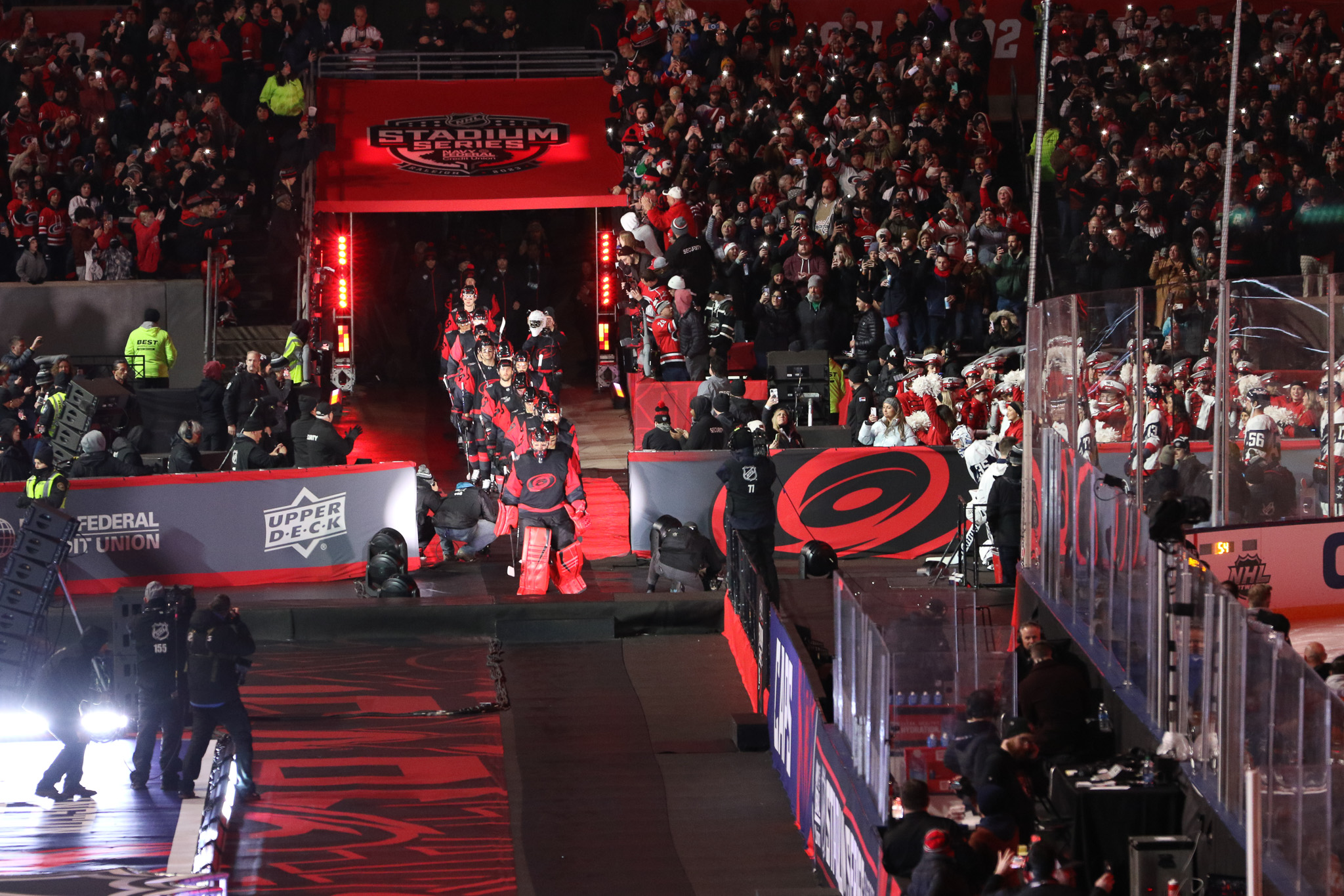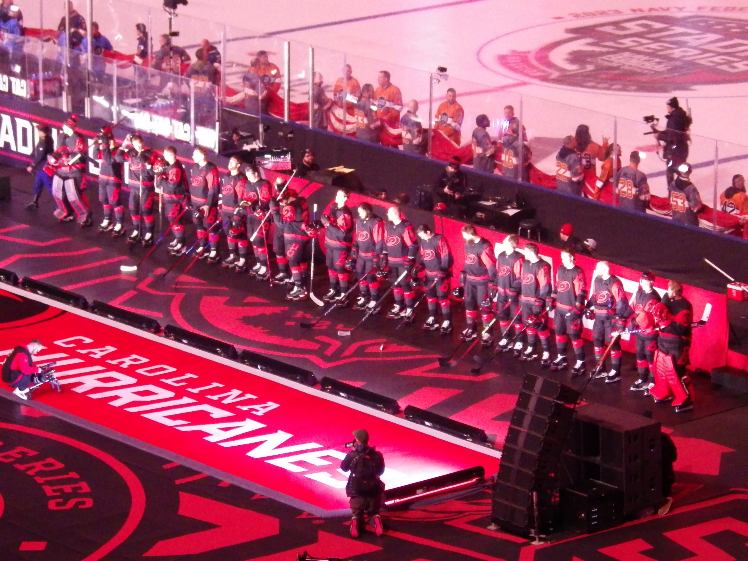 Teams began to emerge down their respective runways as they did at pre-skate, but this time, the Hurricanes advanced first, walking the length of their runway, but instead of stepping onto the ice on the west side, they positioned themselves between the boards and a logo moniker in front of them, closer to and facing the crowd.