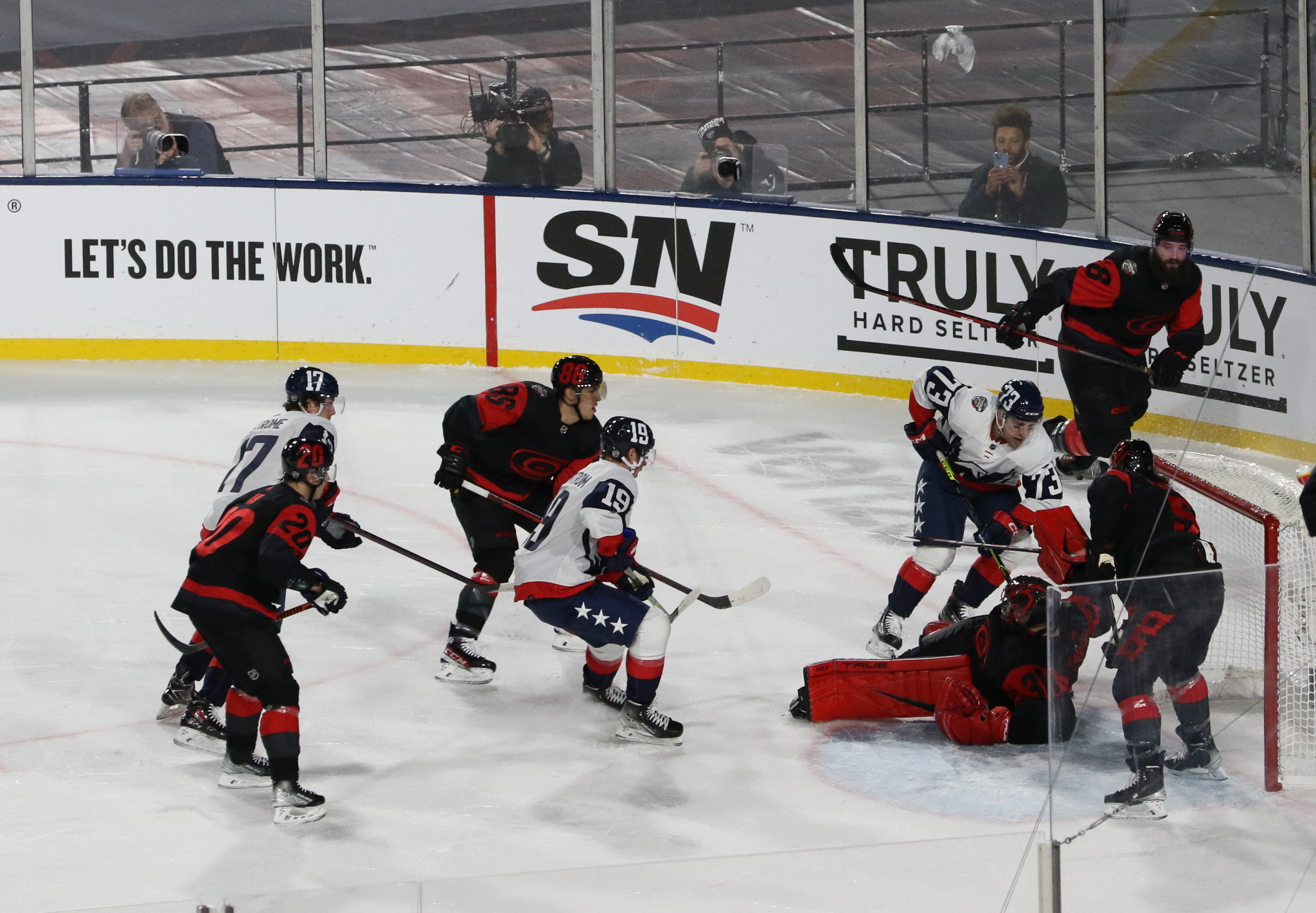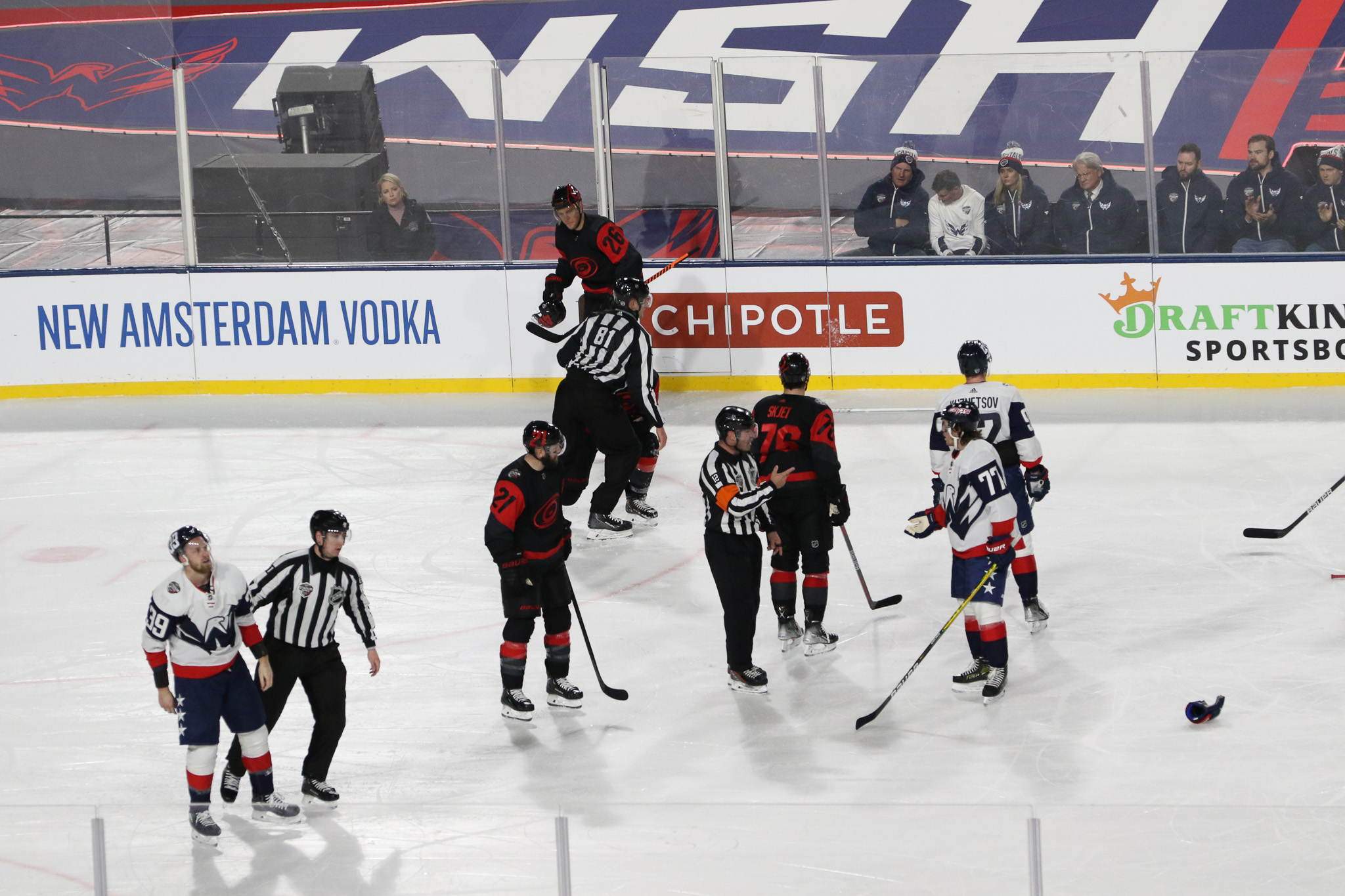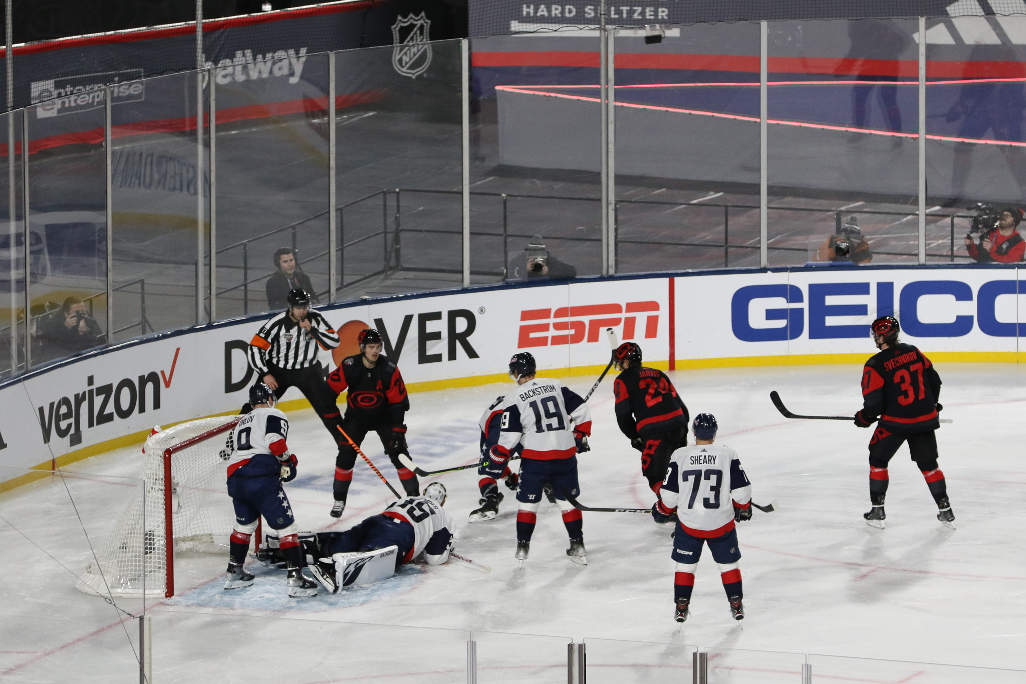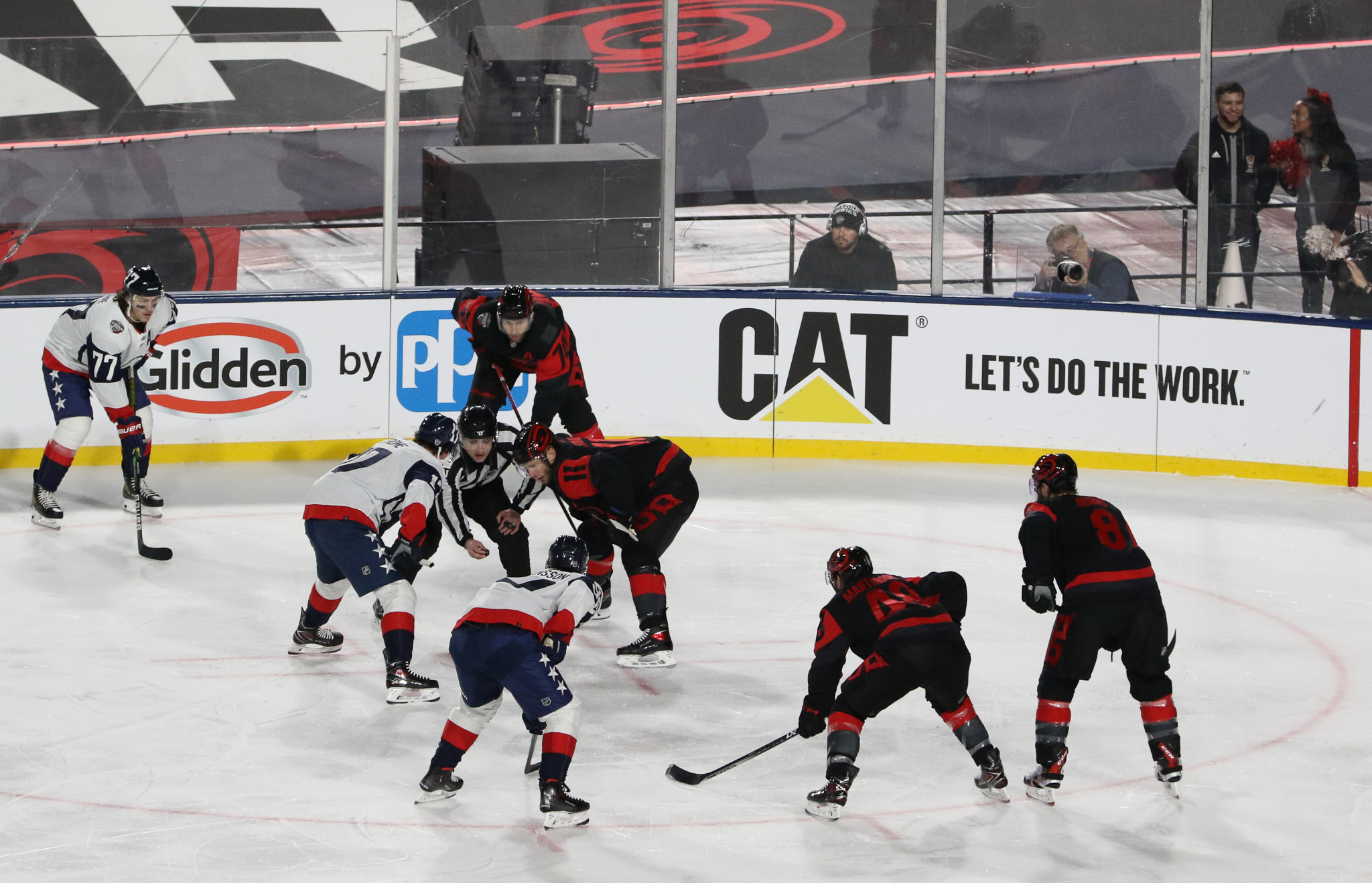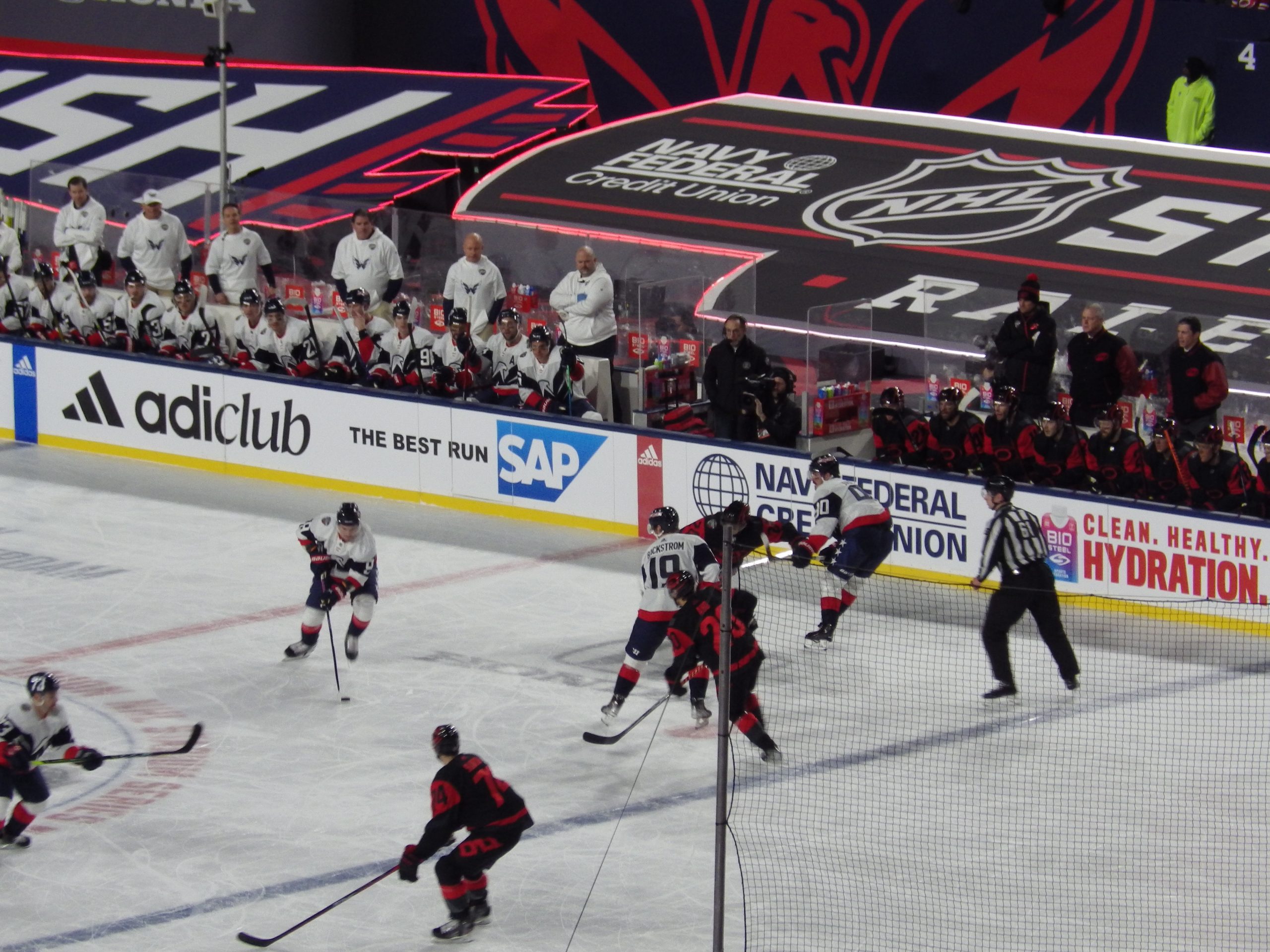 Washington walked behind the entire length of the rink’s north end, making a left and wrapping around the corner to eventually gaining access up a few stops and onto the ice. Carolina soon followed and the energy inside the rink began to grow toward the level being enjoyed in the stands. It was all coming together nicely.