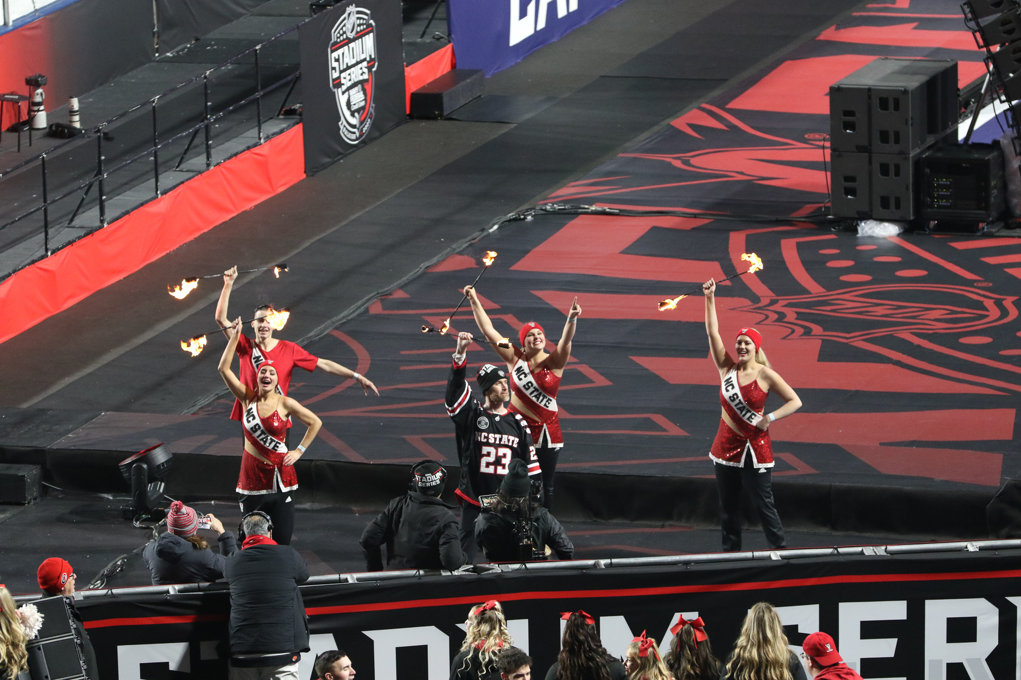 At the south end of the stadium, a stage for pre-game entertainment, elevated and out of the way. This allowed premium-ticketed fans to gain access to special areas and roam through them as they please,in some cases, retrieving pucks which caromed off the glass. This happened several times throughout the night.