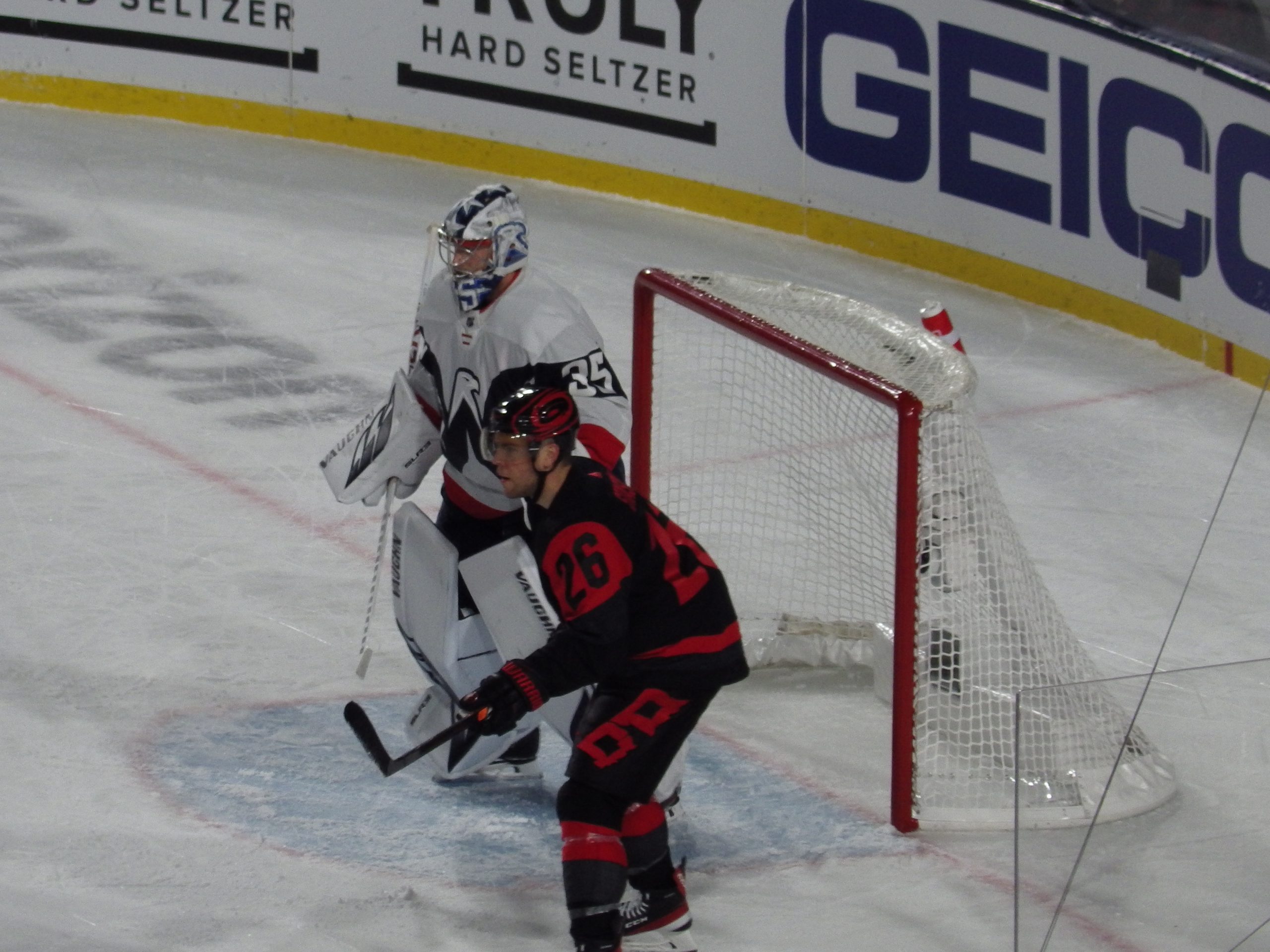 In the Hurricanes’ corner was Ripken the Bat Dog, defending a goal as players shot rubber pucks at the black Labrador retriever who was adorned with a red sweater, blending in nicely with the home team’s threads.