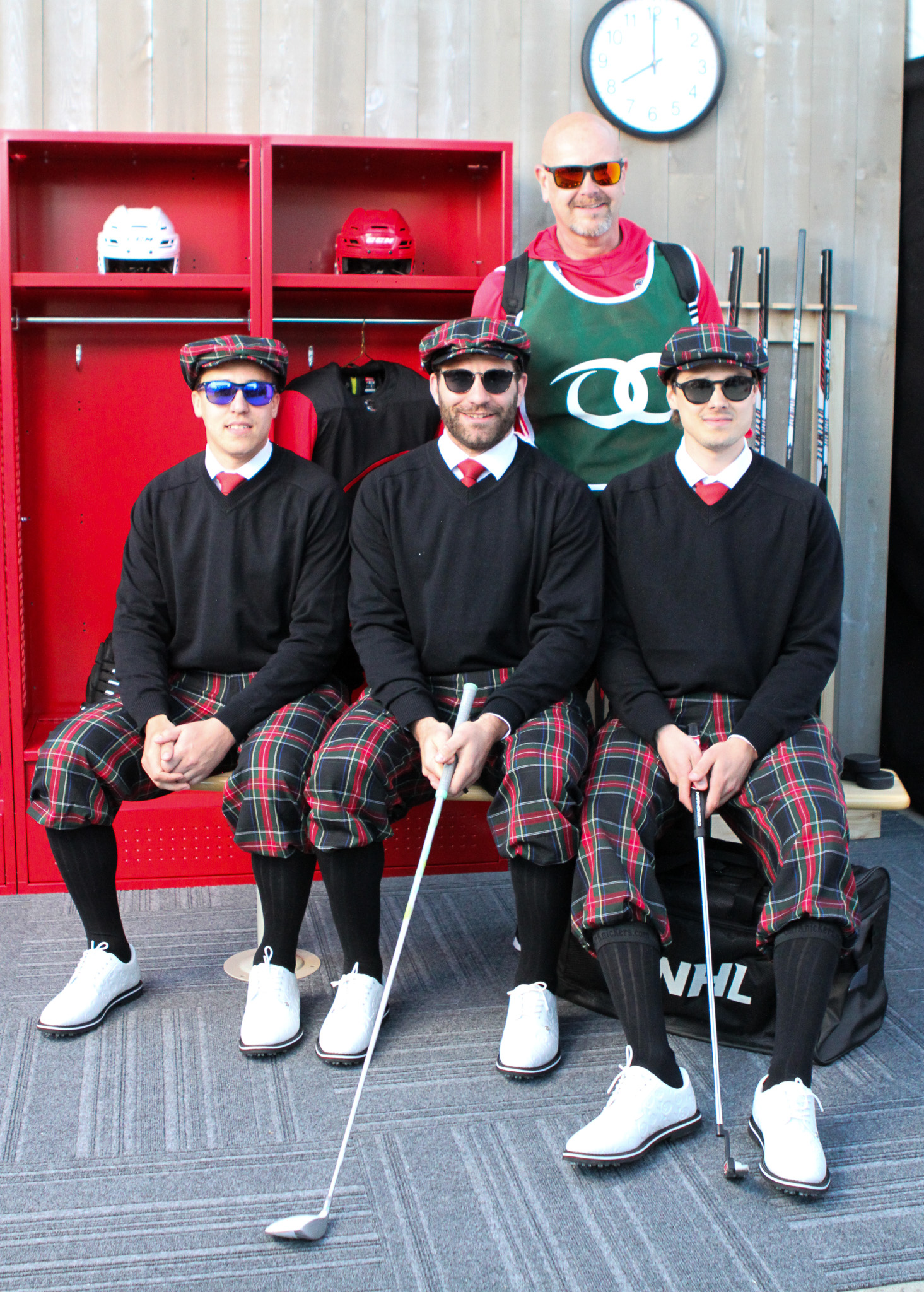 For this game, the Carolina Hurricanes were first to arrive, marching across the street from their indoor rink to the stadium sporting matching plaid golf attire. They wore identical black, white and red plaid knickers and newsboy hats, black sweaters and white golf shoes. Several of the players even carried golf bags and clubs.