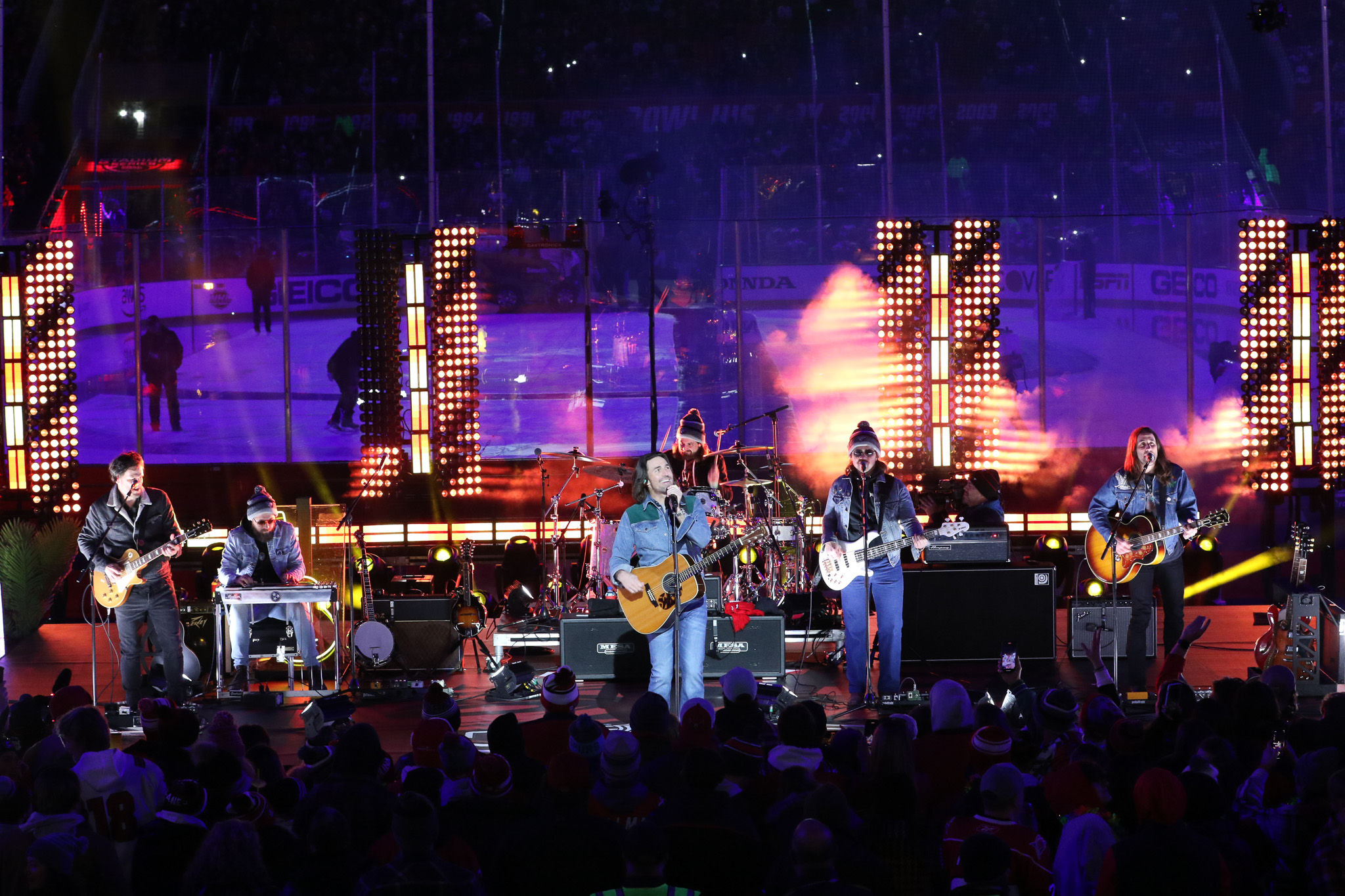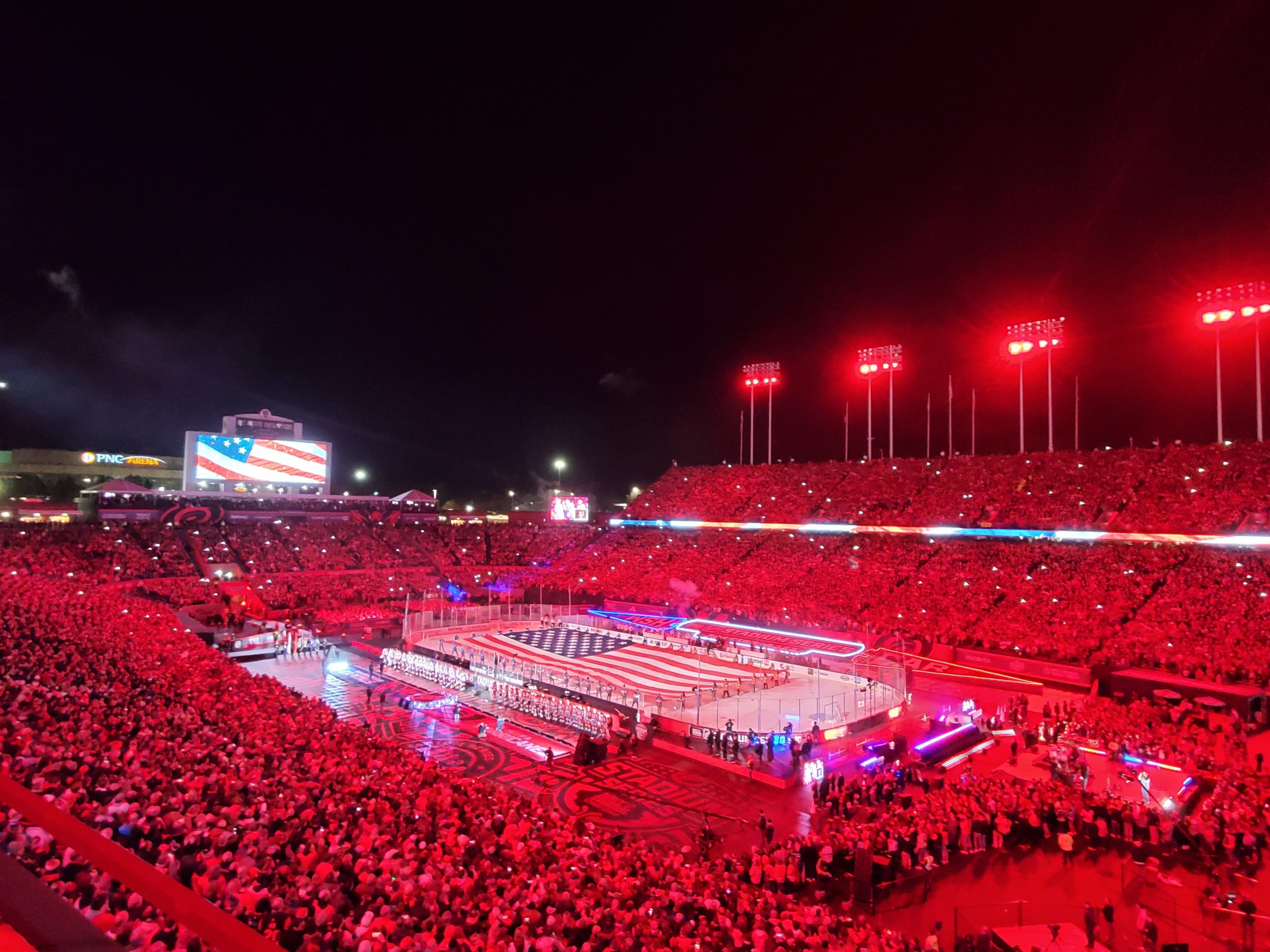 Stadium lights began to flicker and turn intermittently to a deep, rich red color, the hue cascading down to the seating areas and ice surface. It was a spectacular scene.