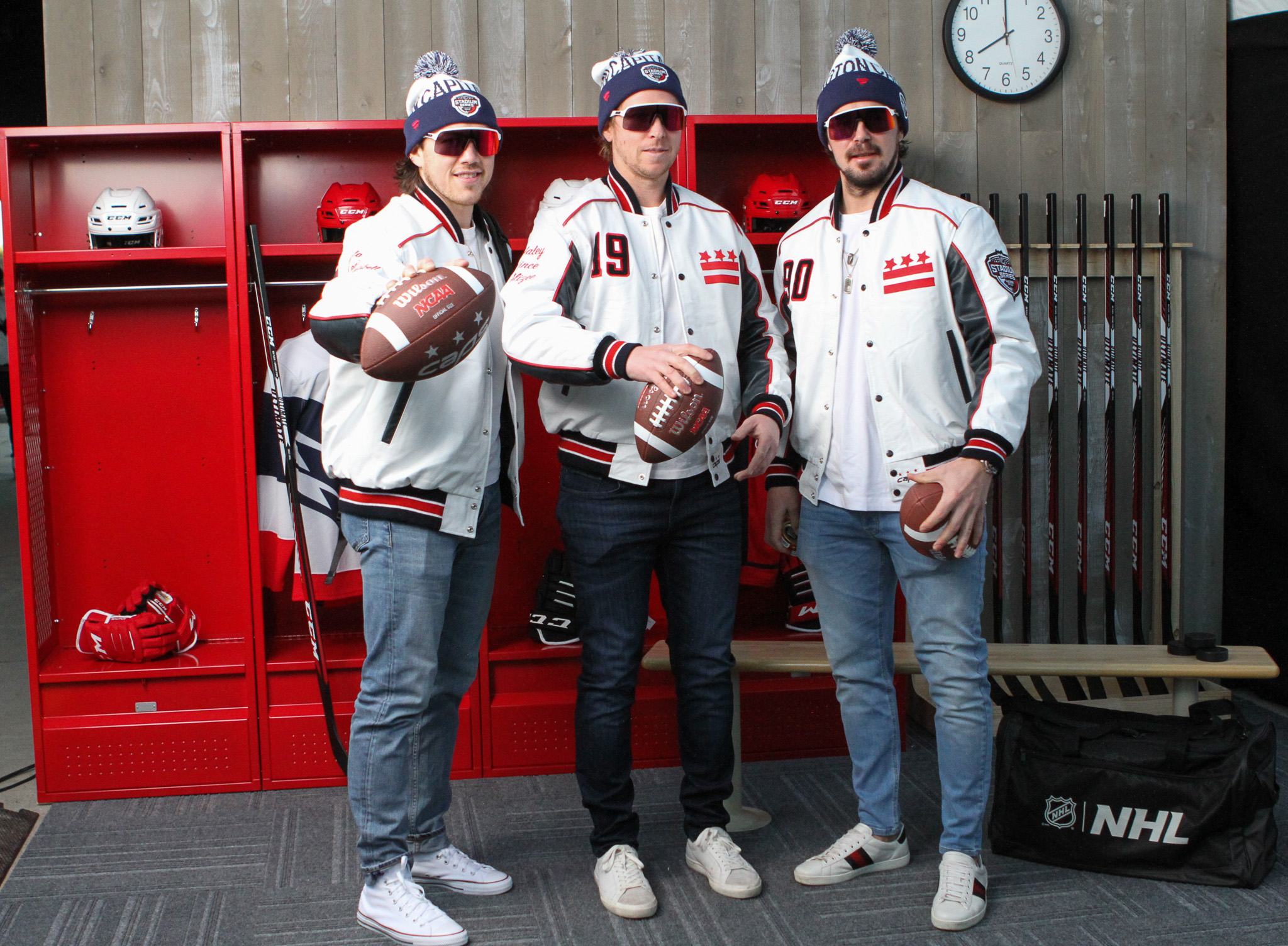 The Capitals arrived in a traditional yellow school bus, not the fully air-conditioned ride they might usually board. Players wore themed varsity letter jackets, custom-designed to reflect their game uniforms with blue jeans and matching toques. Many of them also carried footballs as they exited the bus.