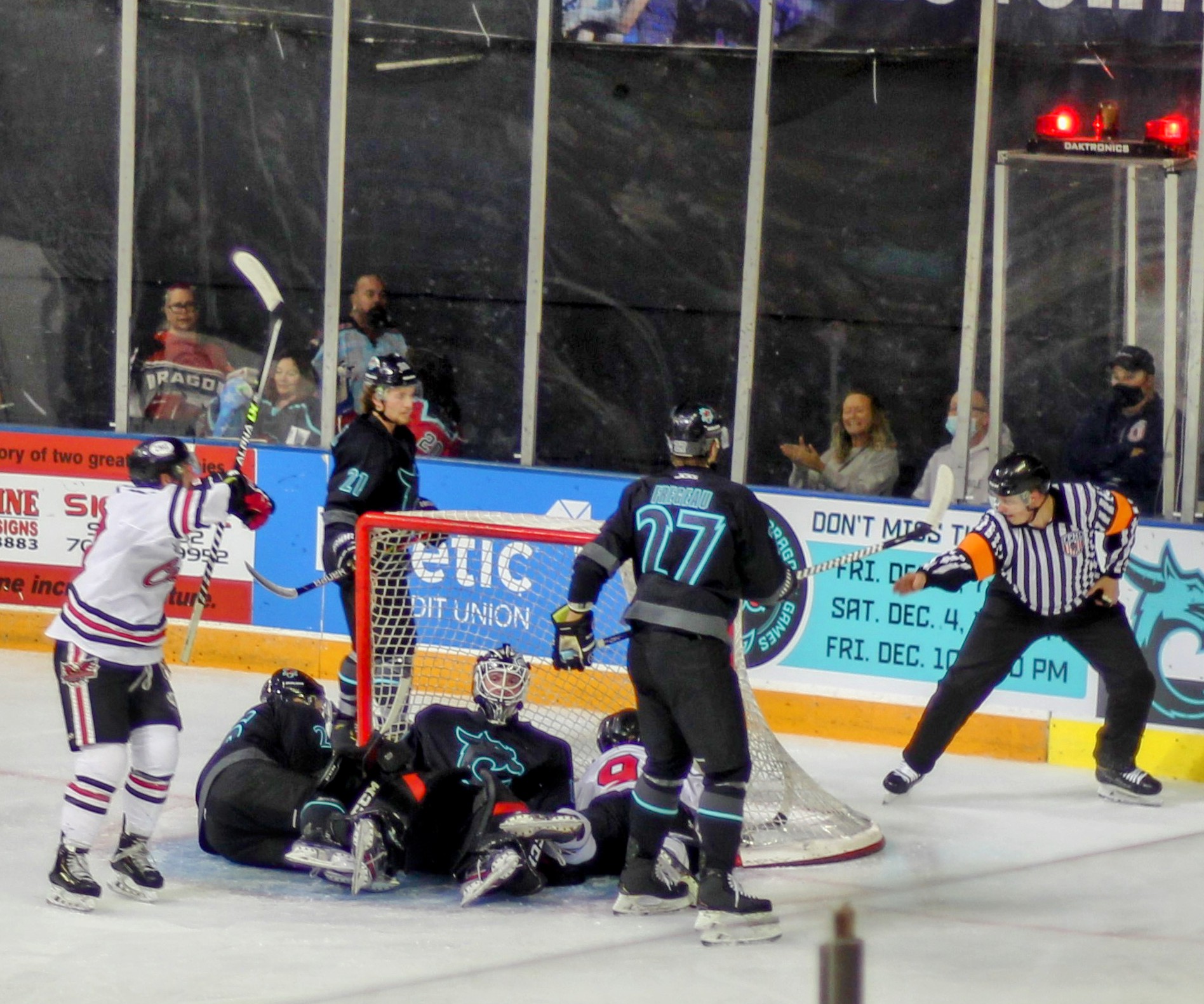 With 9 minutes left in the period and two goals scored in a 3-minute span the Dragons were pressing and firing a good quantity of shots at Paulin, but he and the Thunderbirds defense stood tall to secure the win and all three points.
