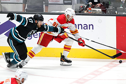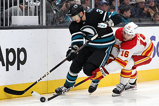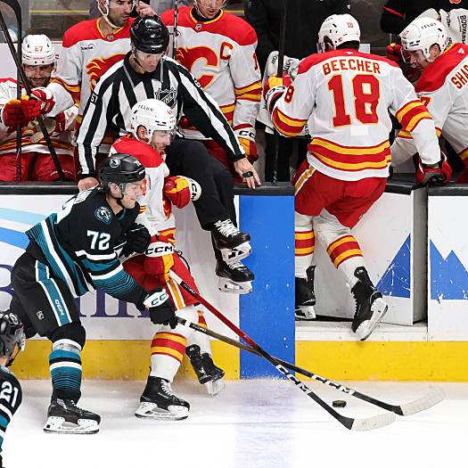 Sharks defenseman Timoth Liljegren (37) attempts to slow down Flames center Nazem Kadri (91) from moving up ice – Photo by Jack Lima