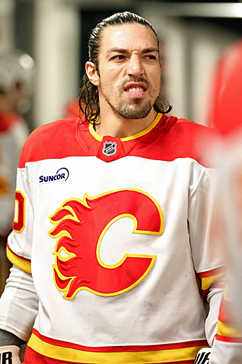 Flames center Ryan Lomberg shows his game face as he enters the ice for pregame warm-ups – Photo by Jack Lima