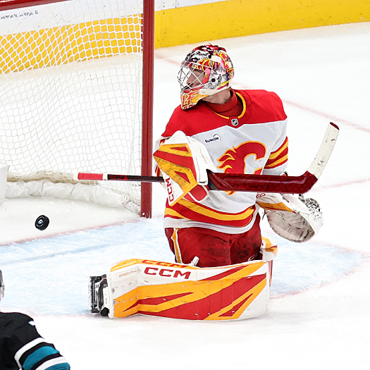 Flames goalie Dustin Wolfe looks behind him as he looks for the puck after blocking a shot – Photo by Jack Lima