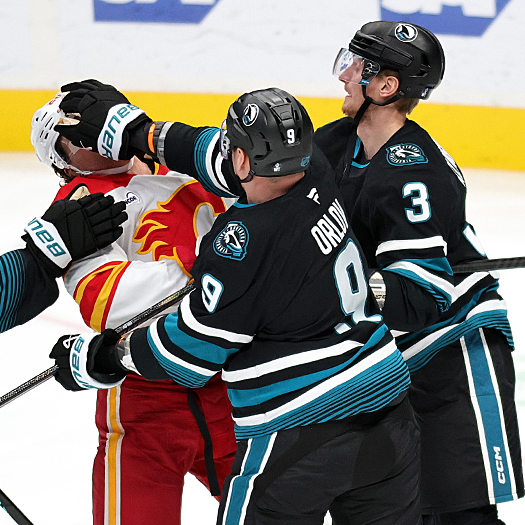 Sharks defenseman Dmitry Orlov (9) gives Flames forward Blake Coleman a glove to the face as John Klingberg )3) moves in to assist – Photo by Jack Lima