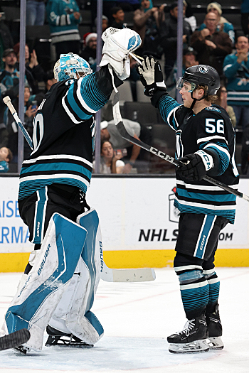 Sharks goalie Yaroslav Askarov celebrates the Sharks victory with teammate Ethan Cardwell (56) – Photo by Jack Lima