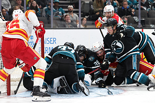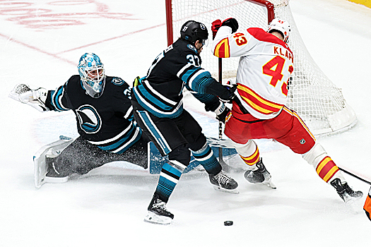 Flames forward Blake Coleman (20) jumps to avoid being hit by a shot in front of Sharks goalie Yaroslav Askarov – Photo by Jack Lima