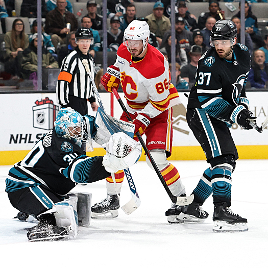Sharks goalie Yaroslav Askarov makes a glove save as Flames forward Joal Farabee (86) and Sharks defenseman Timothy Liljegren (37) look for the puck – Photo by Jack Lima