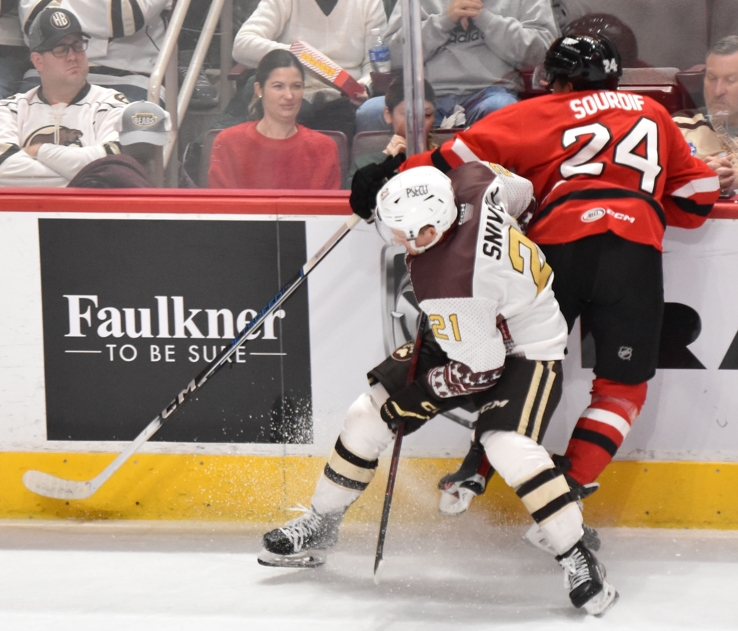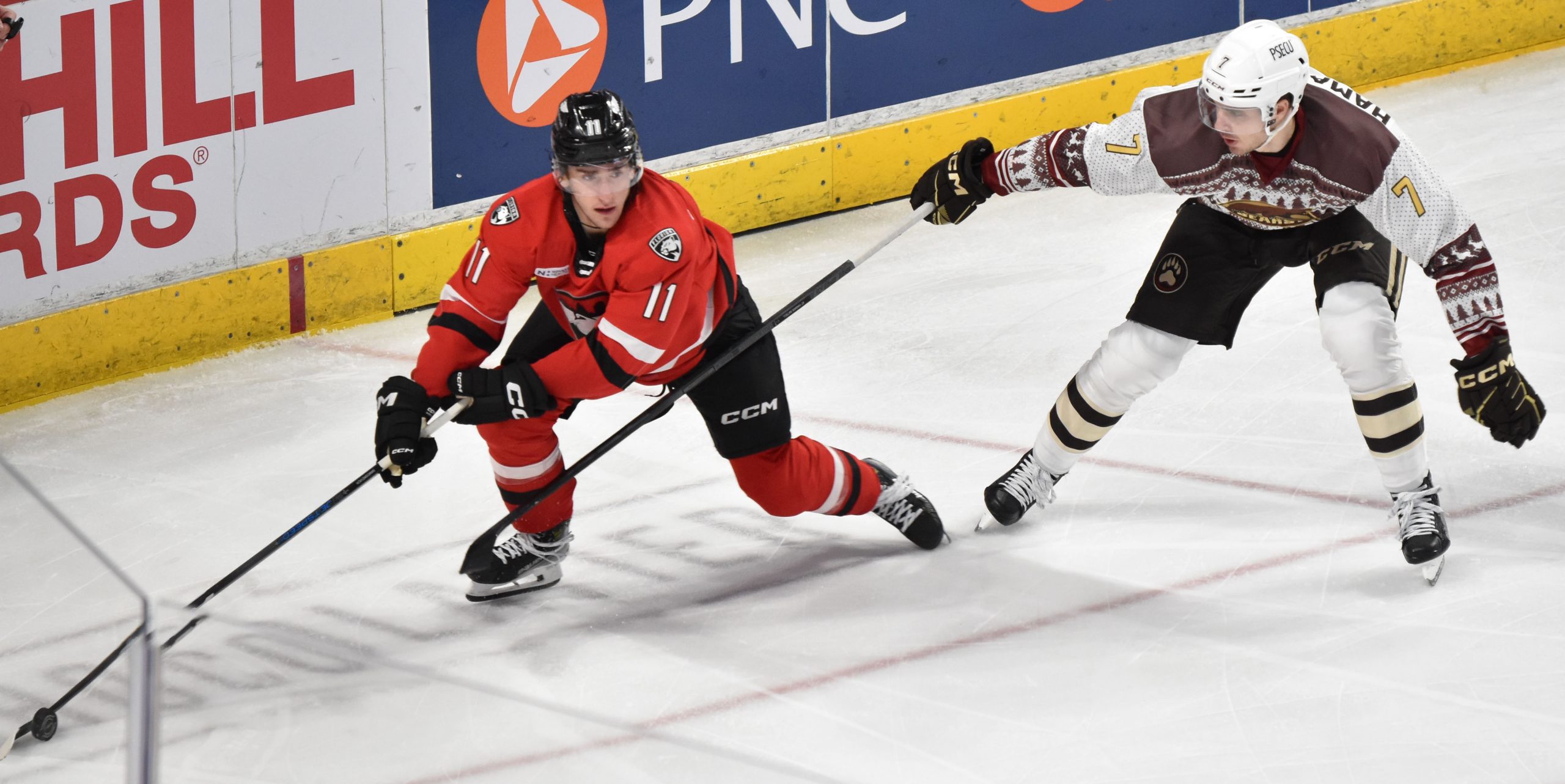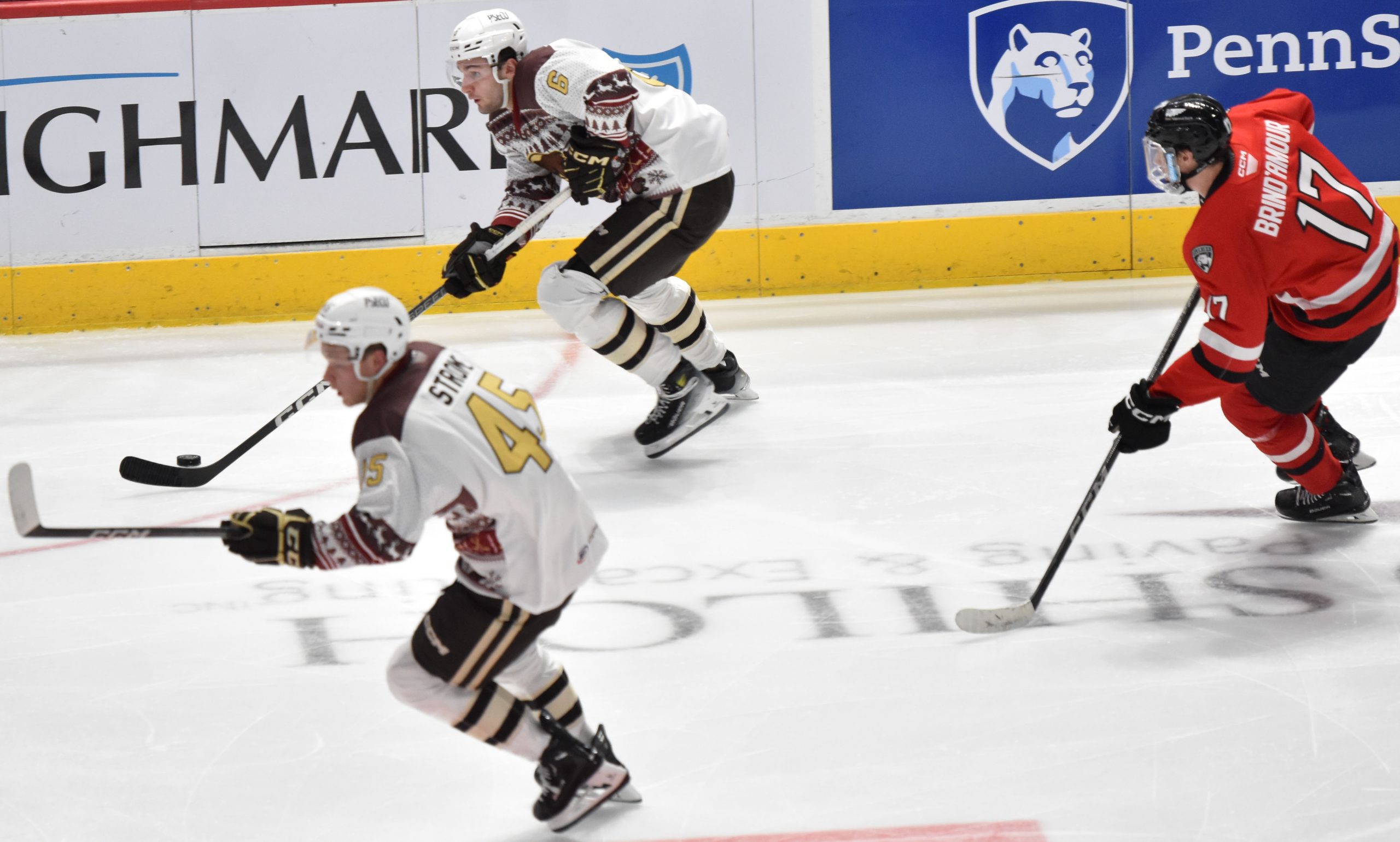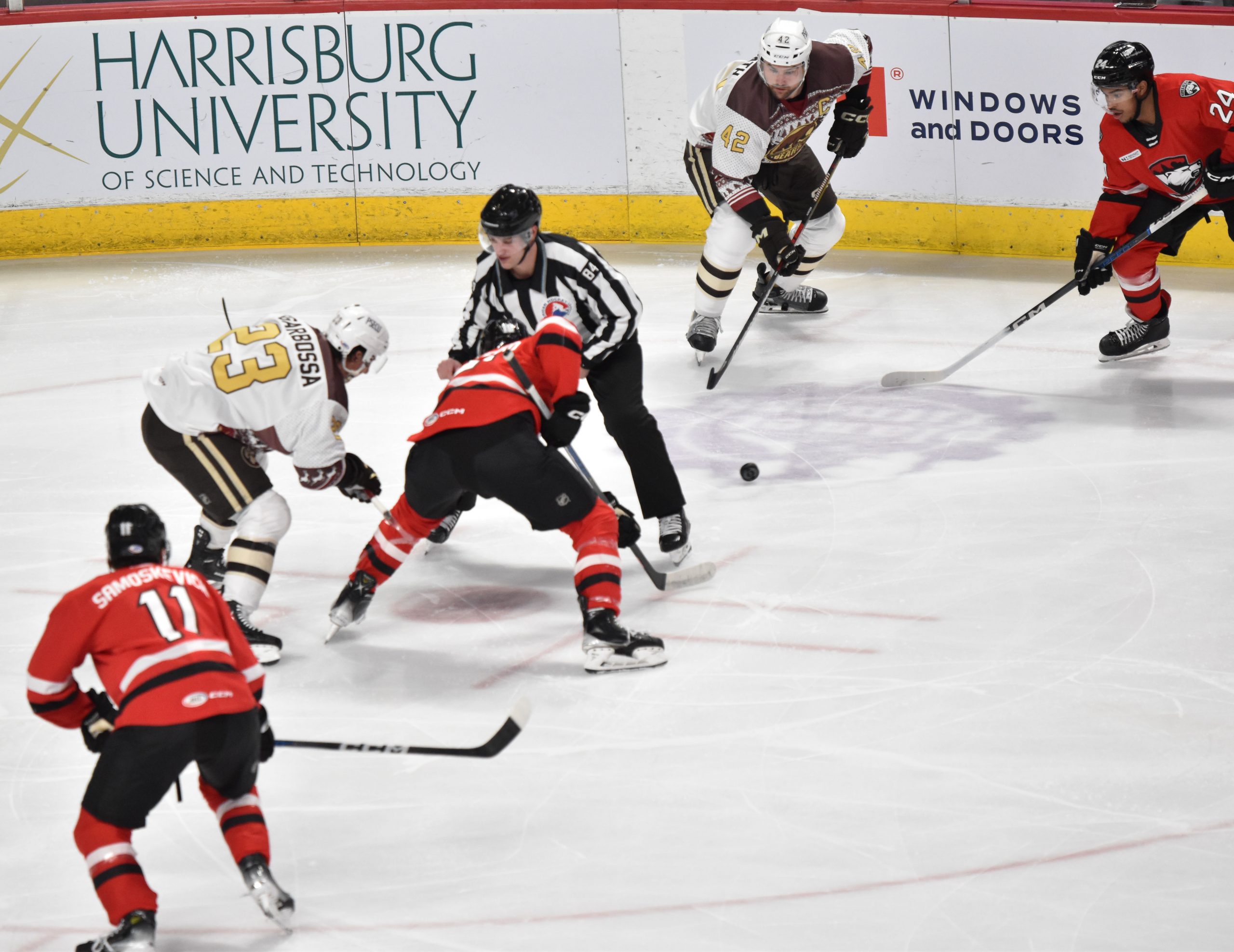 On the final leg of a grueling three-in-three weekend, the Checkers marched into the Hershey Bears’ barn and took down the league’s top team by a score of 3-1.