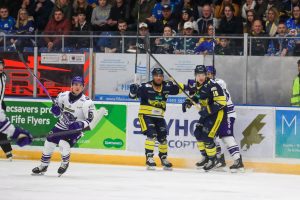 Aittokallio made the first save of the third period as he squeezed his arm tight to keep a shot from Ian Scheid out. The Flyers were penalised again in the 42nd minute as Karlsson got the gate for a hook. The visitors had a number of good looks on their man advantage but Owen was sharp as the Flyers killed off the penalty. A great stick by Scheid in the 47th minute deflected a shot from a dangerous position high into the netting. In the 49th minute some neat stickhandling by Jameson through the slot drew a penalty as Rylan Schwartz was forced to hook him. The Flyers couldn’t have come any closer to tying the game as Winquist wired a one timer from the right circles off the junction of the post and bar and the Clan survived to return to full strength. The home side were back on the power play in the 56th minute as Somoza broke in on the right wing but was hooked by Langan as he tried to go to the net. The Flyers had plays set up in the first half of their man advantage but couldn’t find a quality opening and the Clan went on to complete the kill without any real danger. With 2:21 to play the Flyers called a timeout and following a huge pad save by Owen on Sideroff were able to pull the keeper for the extra skater with 1:40 remaining but the Clan kept the home attacks to the outside and Aittokallio wasn’t called upon to make a significant stop.