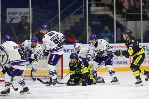 The Clan made a bright start to the game and in the 2nd minute Jason Fram forced the first chance when Shane Owen paddled away the puck in his slot. The Flyers responded and Garet Hunt almost connected with a rebound from Sami Aittokallio but the puck bobbled with a gaping net. The visitors had the lead at 3:02 when a slip in the neutral zone allowed Brayden Burke to tear down the left wing and his pass was perfectly on the tape of Brady Risk who went to the net to scoop the puck past Owen. In the 4th minute Robert Lachowicz tested Owen with a long range slapshot and a minute later a snapshot by Keaton Jameson caught the shaft of Aittokallio’s stick to deflect the puck into the corner. An Ethan Somoza shot in the 6th minute caught the shoulder of the Clan keeper to stay out. Ther Flyers were creating the better chances and in the 10th minute Josh Winquist labelled a shot for the top corner short side but Aittokallio stood tall to make the save. The first powerplay of the game went the way of the Clan in the 11th minute as Ryan Nicholson was sent to the box for high sticking. Brett Neumann had a chance for the Clan but the Flyers almost grabbed a shorthanded goal as Somoza was sprung at the Clan blueline and skated in on Aittokallio who went full splits to take away all of the lower part of the net and keep the puck out. In the final seconds of the man advantage the Flyers were able to scramble the puck away from around their crease as they completed the kill and returned to full strength. The Flyers snatched the game tying goal at 15:05 when Cade Neilson coughed the puck up in neutral ice and Winquist was able to deke Aittokallio before lifting the puck high over the prone keeper. Mason Alderson had a shot from the high slot go in and out of Aittokallio’s glove in the 17th minute and the Flyers ended the period on the powerplay as Jameson was tripped by Joe Hazeldine. The visitors however were strong on the kill with the Flyers being unable to get anything set up.
