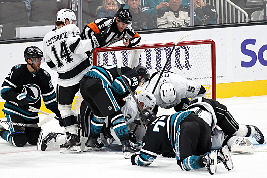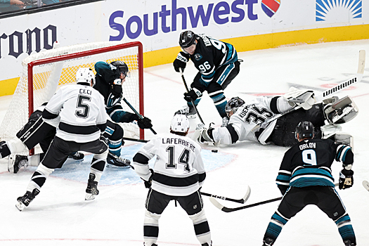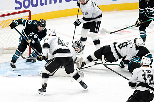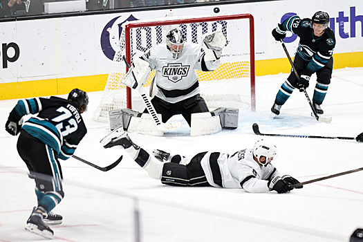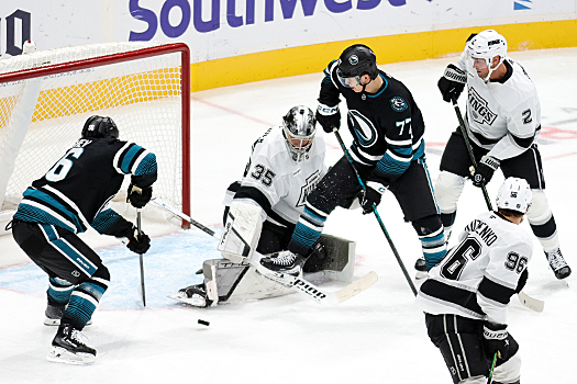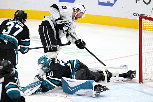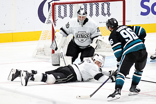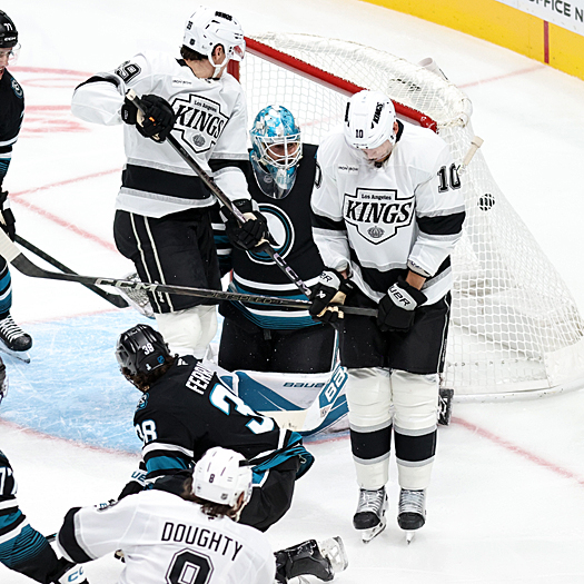 Kings’ forwards Jeff Malott (left) and Corey Pery (10) screen Sharks goalie Yaroslav Askarov on a shot by Drew Doughty (8) that resulted in the Kings third goal – Photo by Jack Lima