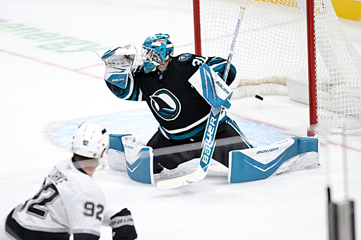 Sharks goalie Yaroslav Askarov stretches out to make a kick save on a shot from Adrian Kempe (9) during third period action – Photo by Jack Lima