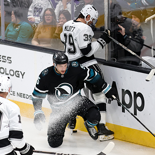 Kings’ forward Jeff Malott (39) and Sharks’ defenseman Vincent Desharnais (5) battle for the puck behind the net – Photo by Jack Lima
