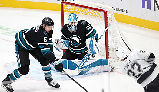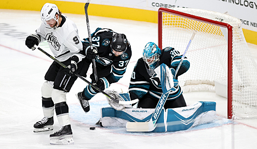Sharks goalie Yaroslav Askarov makes a save as Kings forward Adrian Kempe (9) attempts to provide a screen with Timothy Liljegren (53) providing defensive support – Photo by Jack Lima