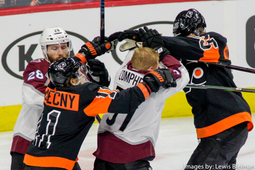 Some extracurricular activities after play stops by J.T. Compher #37 of the Colorado Avalanche, James van Riemsdyk #25 of the Philadelphia Flyers and Travis Konecny #11 of the Philadelphia Flyers, Ian Cole #28 of the Colorado Avalanche 2020