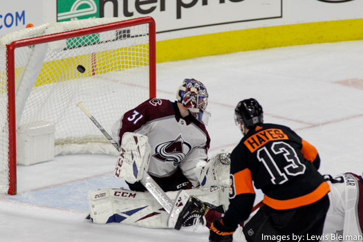Kevin Hayes #13 of the Philadelphia Flyers scores an unassisted shorthanded goal in the third period against the Colorado Avalanche Goalie Philipp Grubauer #31 2020
