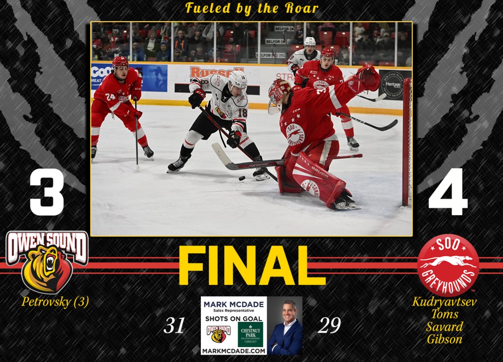 Owen Sound had looks as time ticked down but were stymied by Ivanov and the Hounds, dropping their fourth straight game.