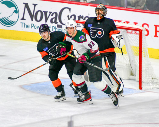 The Coyotes held that lead until the Flyers’ Morgan Frost struck at 4:23 of the middle frame to tie it, 1-1.