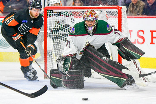 Jason Zucker #16 of the Arizona Coyotes jumps over Flyers goalie Samuel Ersson #33 while in pursuit of the loose puck