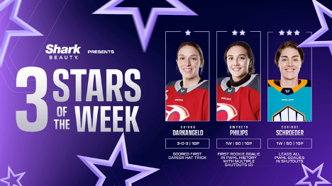NEW YORK AND TORONTO – Ottawa Charge forward Shiann Darkangelo, Charge goaltender Gwyneth Philips and New York Sirens goaltender Corinne Schroeder have been named the Professional Women’s Hockey League (PWHL) 3 Stars of the Week presented by Shark Beauty Canada following games from Mar. 31 to Apr. 6.