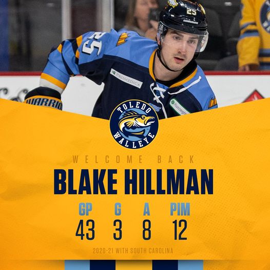 TOLEDO, OH – Defenseman Blake Hillman has agreed to terms with the Toledo Walleye for the 2021-2022 season.