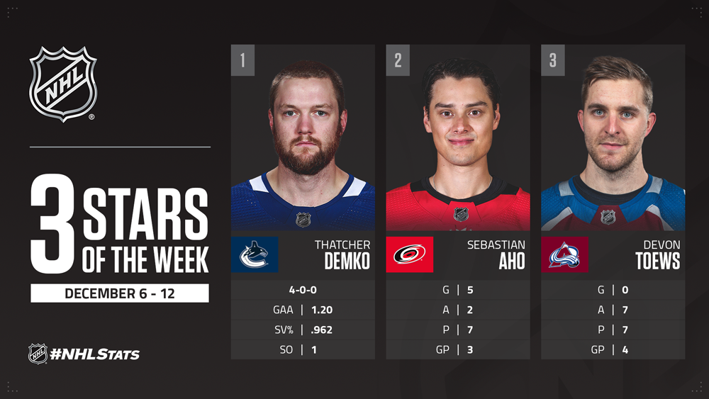 NEW YORK – Vancouver Canucks goaltender Thatcher Demko, Carolina Hurricanes center Sebastian Aho and Colorado Avalanche defenseman Devon Toews have been named the NHL’s “Three Stars” for the week ending Dec. 12.