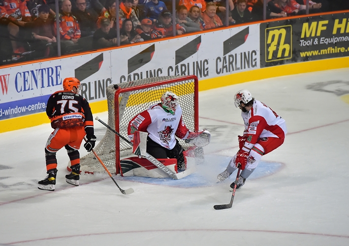Just shy of the seven-minute mark, the Devils profited from a defensive zone turnover which allowed Justin Crandall to break 3-on-1, but he needed no help in shooting past Rok StojanoviÄ blocker side. A great opening period for the visitors got even better when Brodie Dupont won the puck too easily in the corner and found Cole Sandford in front for the top-shelf finish. StojanoviÄ was pulled having let in three goals on six shots as Aaron Fox tried to inject some life into his team.