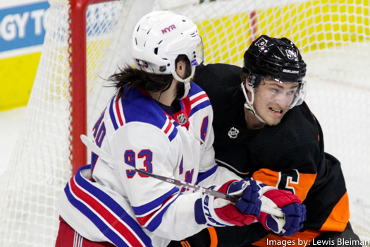 Mika Zibanejad #93 of the New York Rangers and Travis Sanheim #6 of the Philadelphia Flyers battle in front of the Philadelphia Flyers crease.