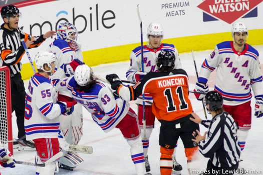 Travis Konecny #11 of the Philadelphia Flyers gives Mika Zibanejad #93 of the New York Rangers a shove after the whistle.