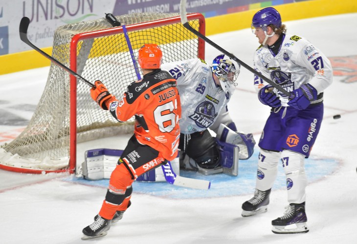The opening goal went the way of the Steelers off the stick of American defenseman Brien Diffley at 14:12. A heavy forecheck from Mikko Juusola forced the Clan to cough up the puck behind their own net, and Juusola’s quick pass into the slot found oncoming Diffley finishing low past the pad of Clan netminder Landon Bow. The hosts doubled their lead through British forward Finlay Ulrick at 16:18: a cycle play from Diffley, Joona Huttula and Ulrick led to space opening for the young Brit. The one-time effort squeaked through Bow’s pads as the Clan goalie looked to thy is disbelief.