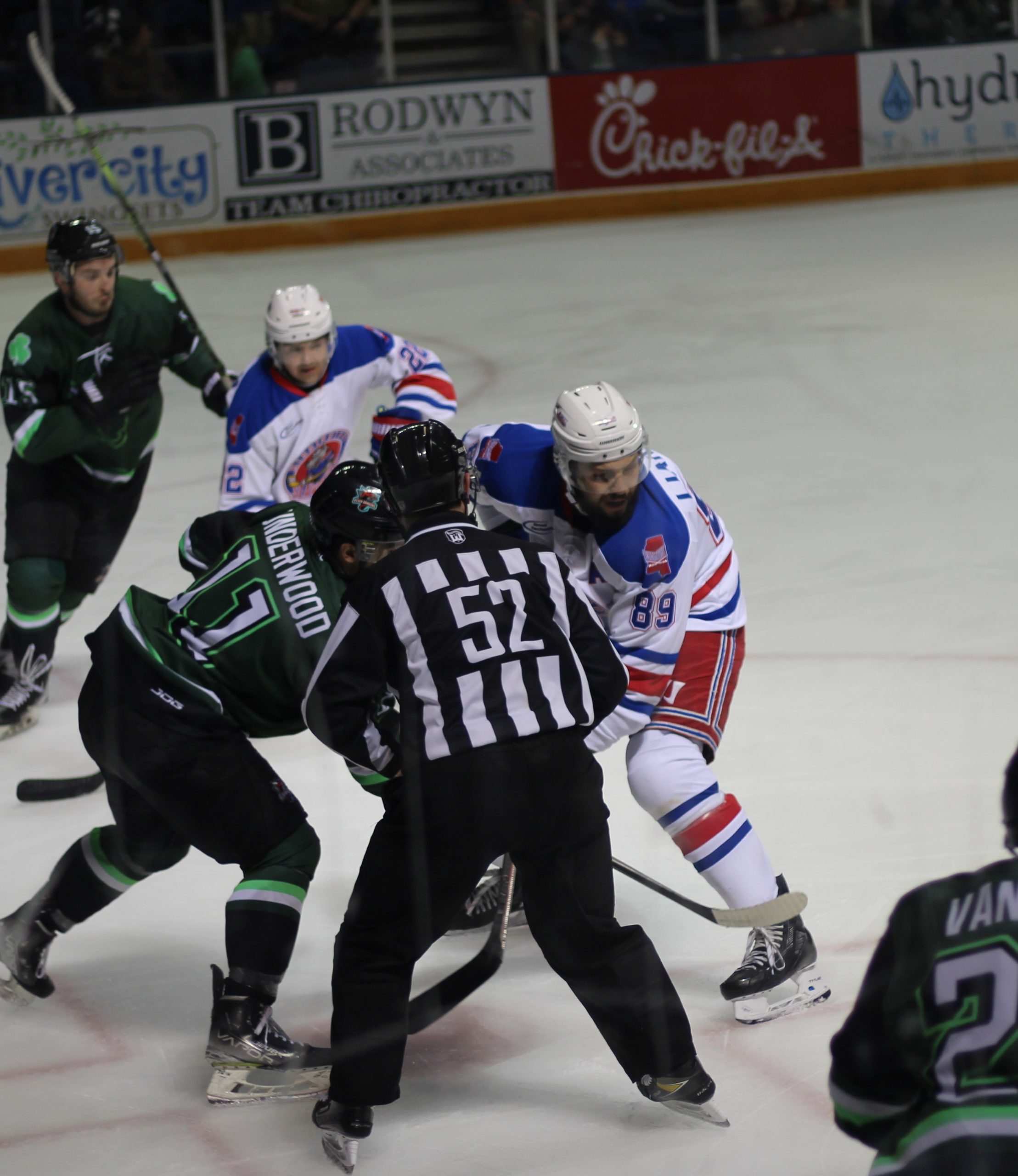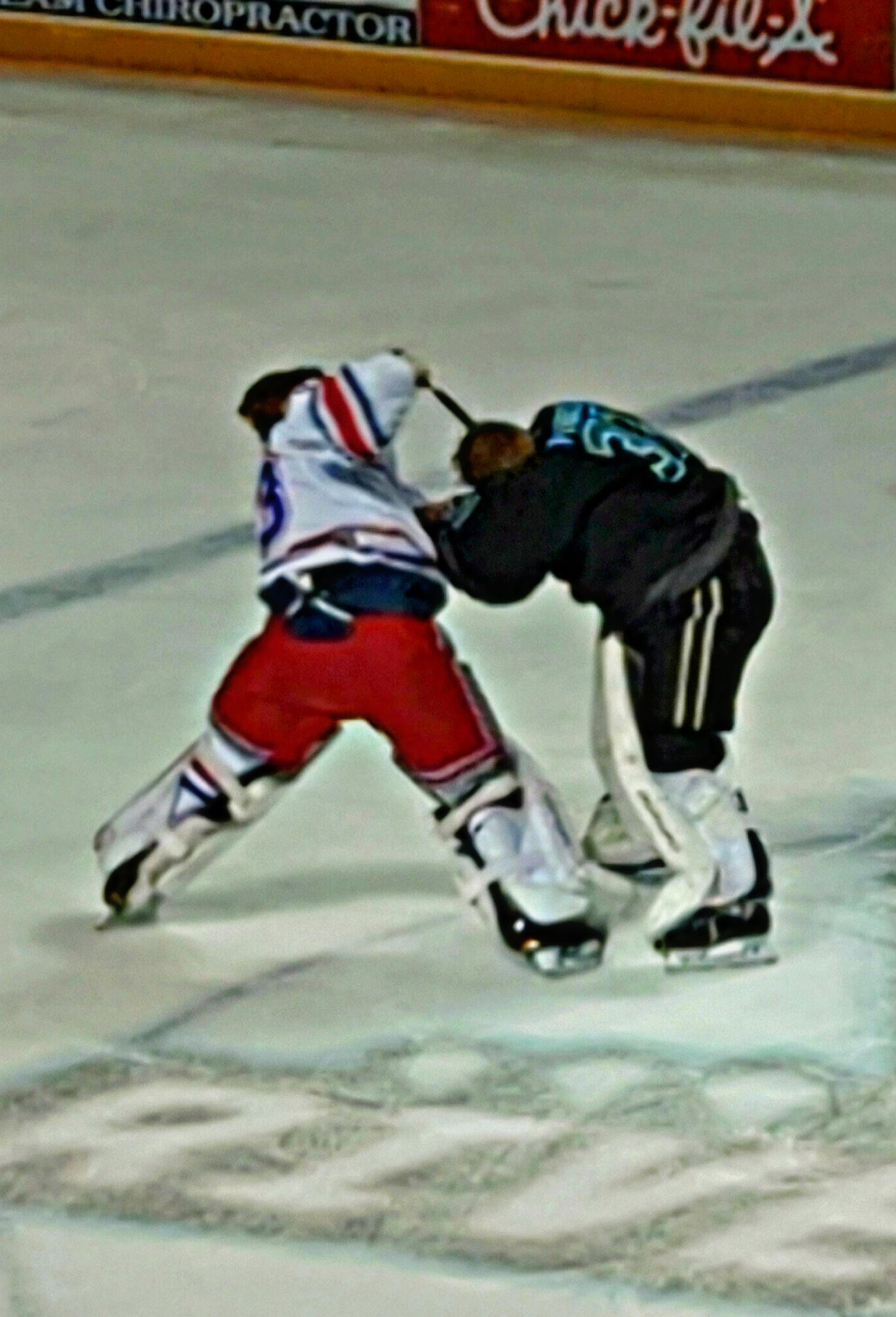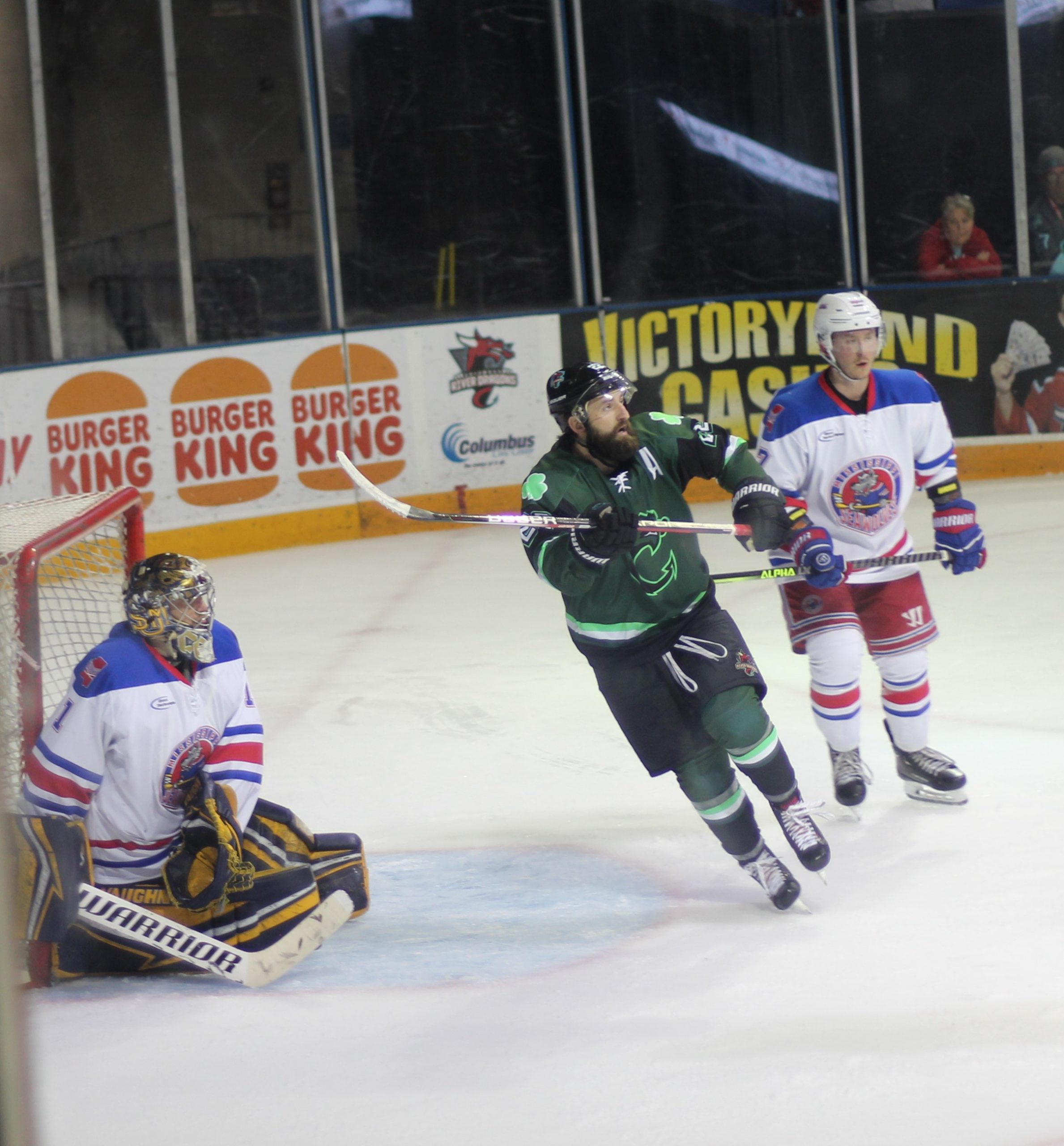 Columbus, GA – This was a night to remember for fans, players, and hockey enthusiast for sure. It started out with the legends game where current coach Bechard got into a friendly fight with former cottonmouth player Wilson. There was a goalie dancing on center ice, and a friendly bench clearing finish. This was followed up by the dragons and sea wolves match which wouldn’t disappoint with 82 minutes worth of penalties within just the first period.