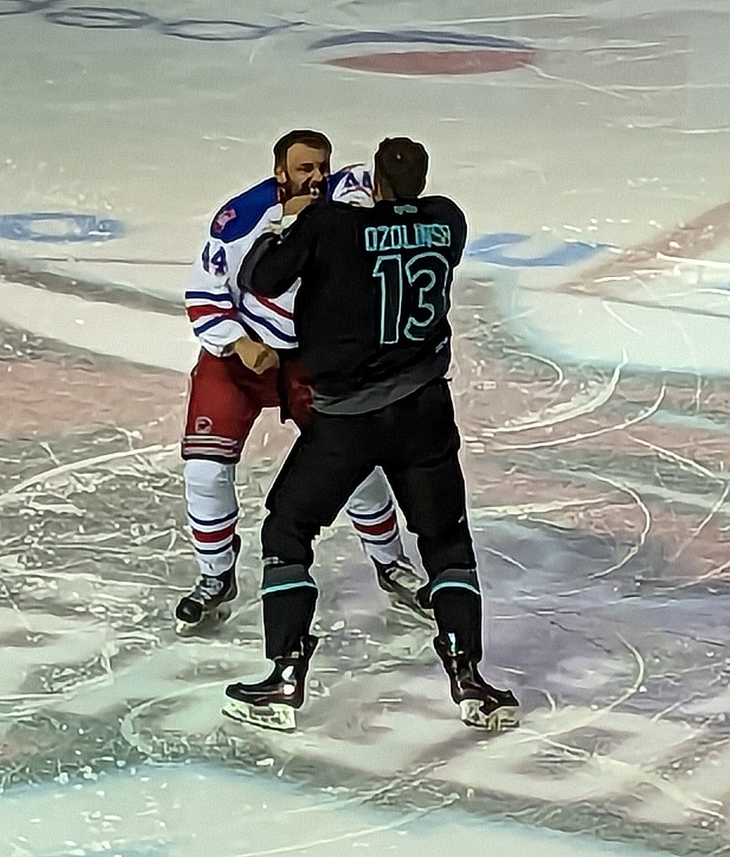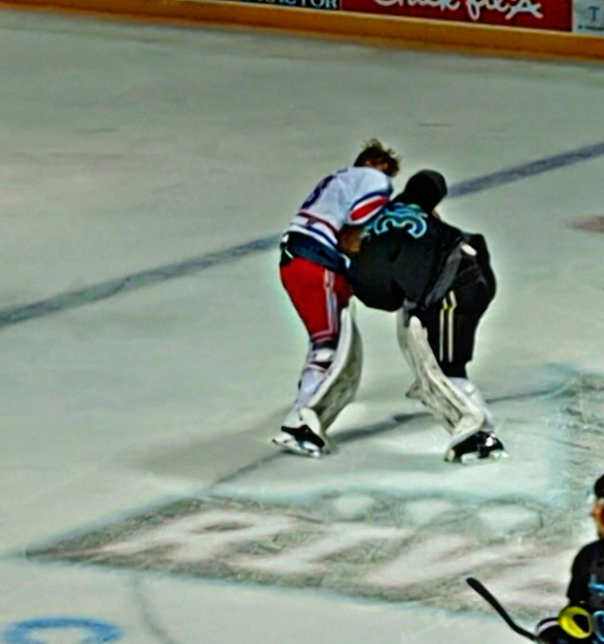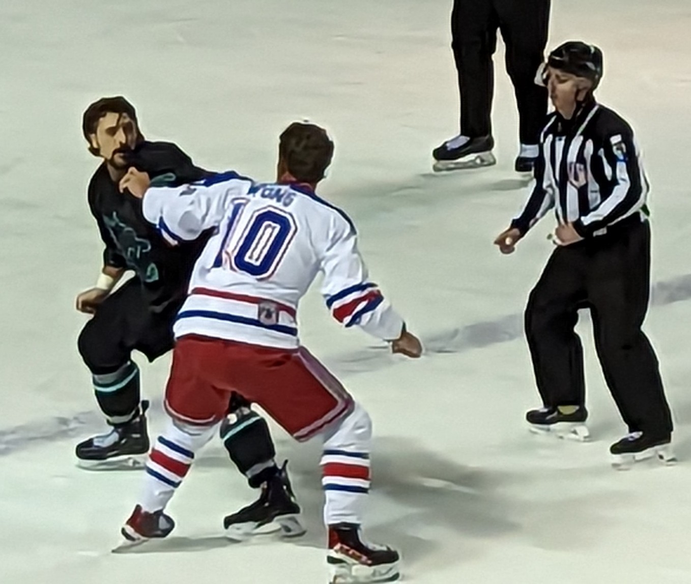The first period continued with the excitement, and it started quick with a fight between Ozolinsh and Michel at the 0:02 mark in the first period. The dragons would strike first on the score board with King scoring at the 04:12 mark. They would strike fast again with Vannelli hitting the back of the net at the 05:09 mark. Right after the puck drop of that goal, Ozolinsh and Michel would go for round two for the night. The sea wolves would have a 5-3-man advantage with a double minor and another minor at the 07:55 mark. The dragons would manage to fight off the penalties to get back to full strength. At the 10:59 mark, there would be a lot of scuffles at the sea wolves’ goal, but the infamous goalie fight where Pavlas and Sheppard called each other out to fight on center ice would take the spotlight. Moving through the rest of the period, there was another fight at the 16:00 mark between Greco and Wong which would help lead into the first intermission.