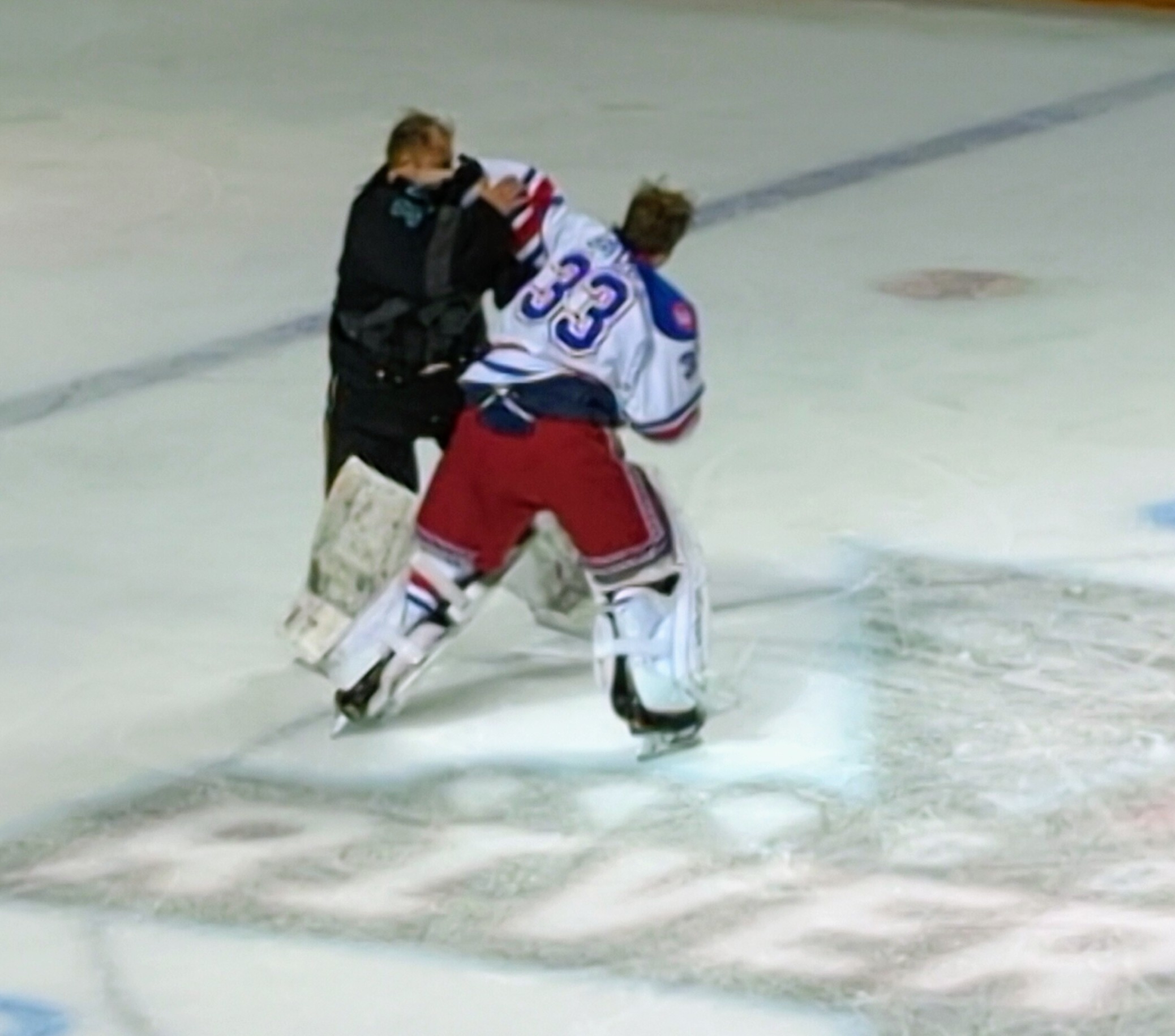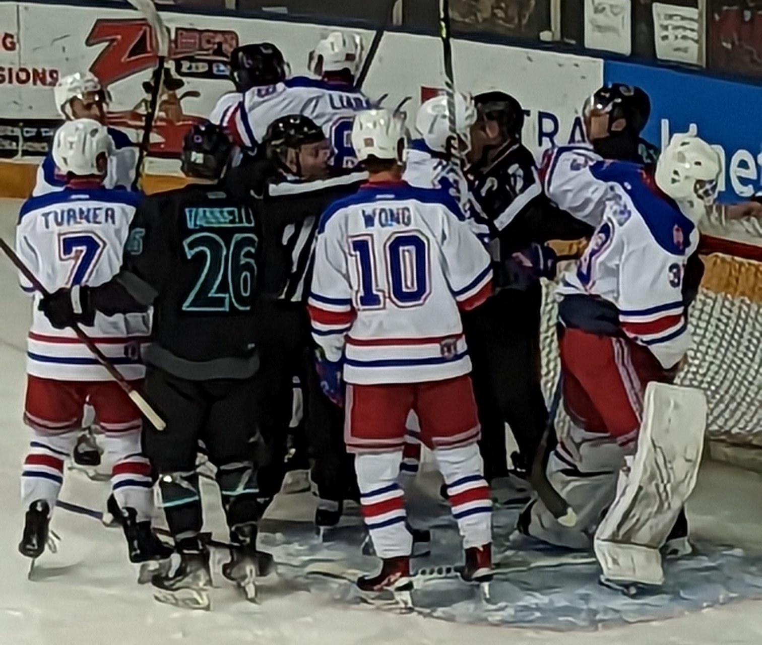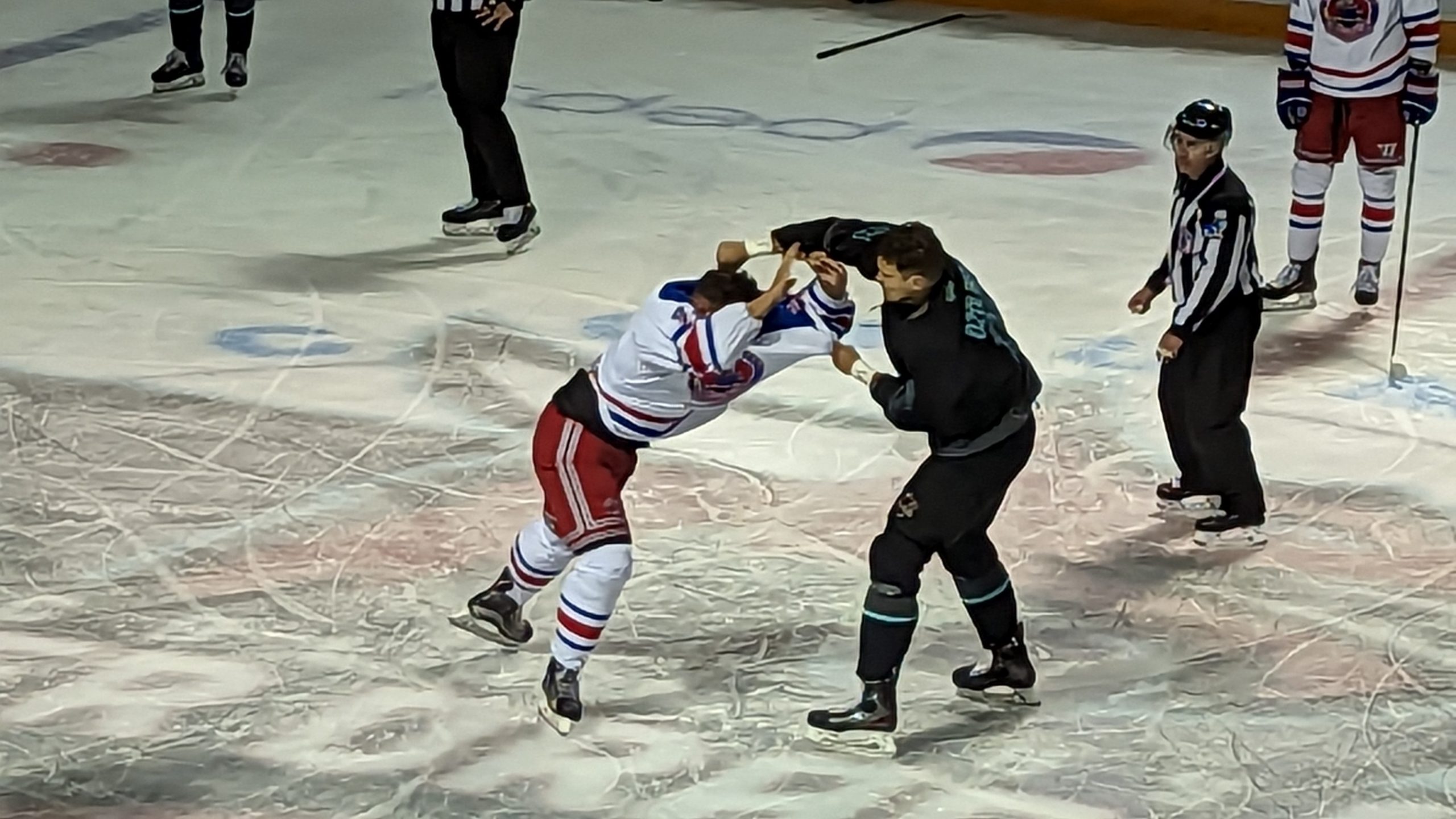 The first period continued with the excitement, and it started quick with a fight between Ozolinsh and Michel at the 0:02 mark in the first period. The dragons would strike first on the score board with King scoring at the 04:12 mark. They would strike fast again with Vannelli hitting the back of the net at the 05:09 mark. Right after the puck drop of that goal, Ozolinsh and Michel would go for round two for the night. The sea wolves would have a 5-3-man advantage with a double minor and another minor at the 07:55 mark. The dragons would manage to fight off the penalties to get back to full strength. At the 10:59 mark, there would be a lot of scuffles at the sea wolves’ goal, but the infamous goalie fight where Pavlas and Sheppard called each other out to fight on center ice would take the spotlight. Moving through the rest of the period, there was another fight at the 16:00 mark between Greco and Wong which would help lead into the first intermission.