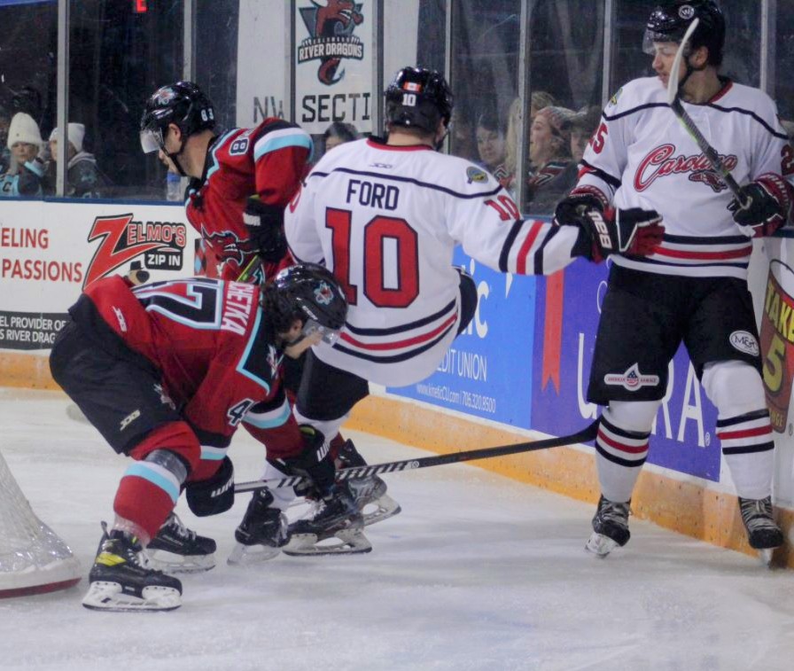 Neither team managed a goal until the third period, when Nolan Slachetka finally broke the deadlock with a slapshot from the left point at 8:23. The shot beat Carolina goaltender Mario Cavaliere (37 saves) high over the shoulder through traffic to make it 1-0 River Dragons.