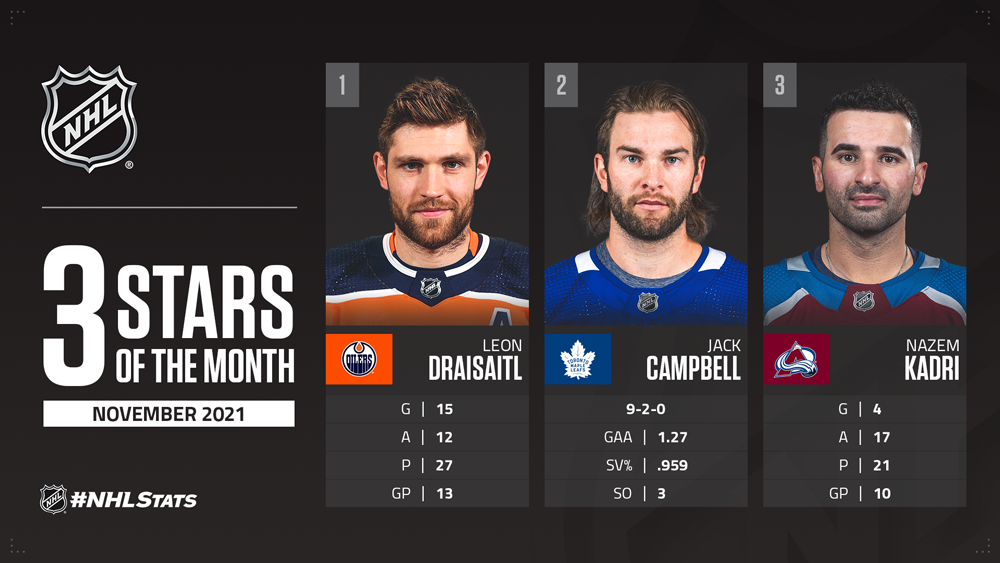 NEW YORK – – Edmonton Oilers center Leon Draisaitl, Toronto Maple Leafs goaltender Jack Campbell and Colorado Avalanche center Nazem Kadri have been named the NHL’s “Three Stars” for the month of November.