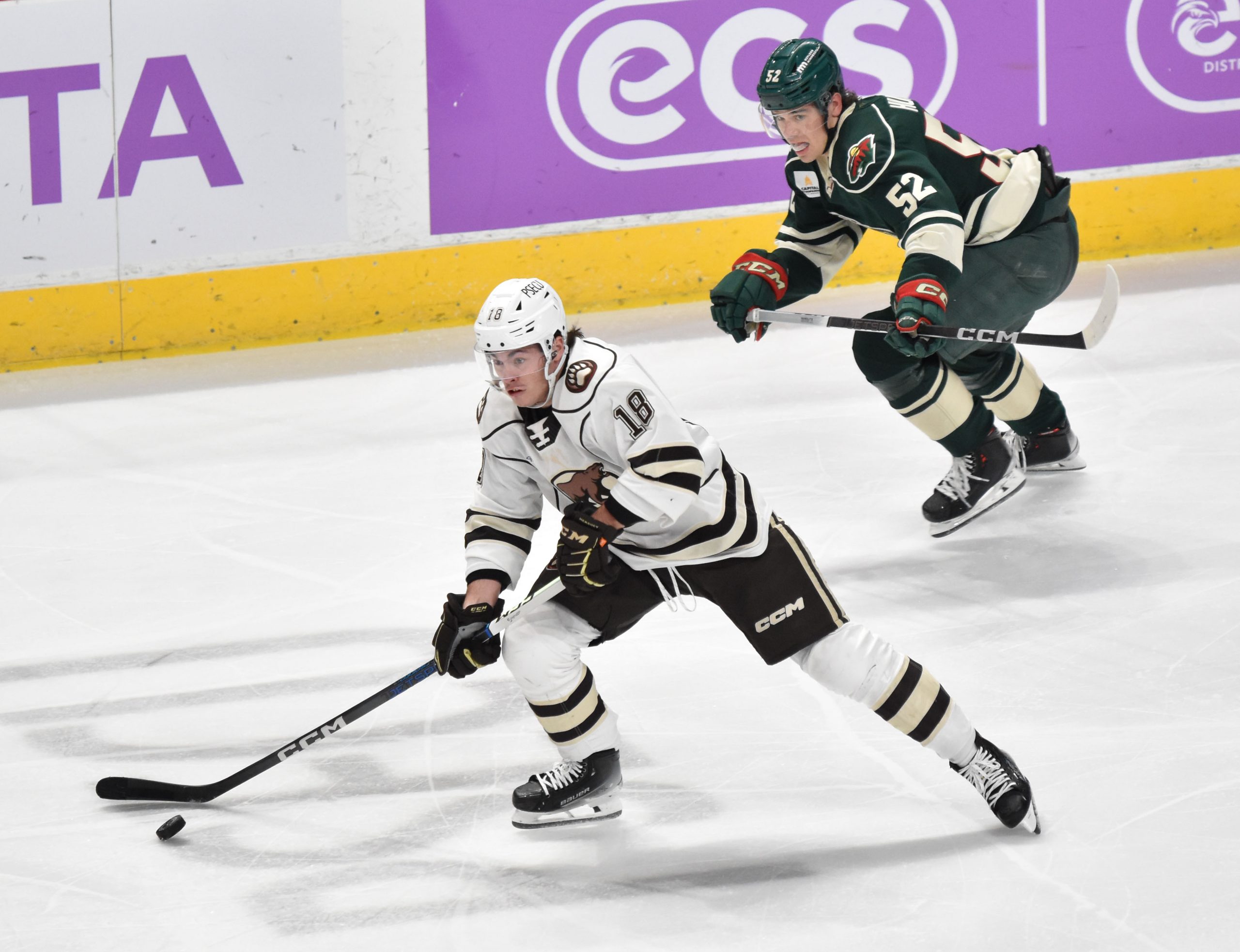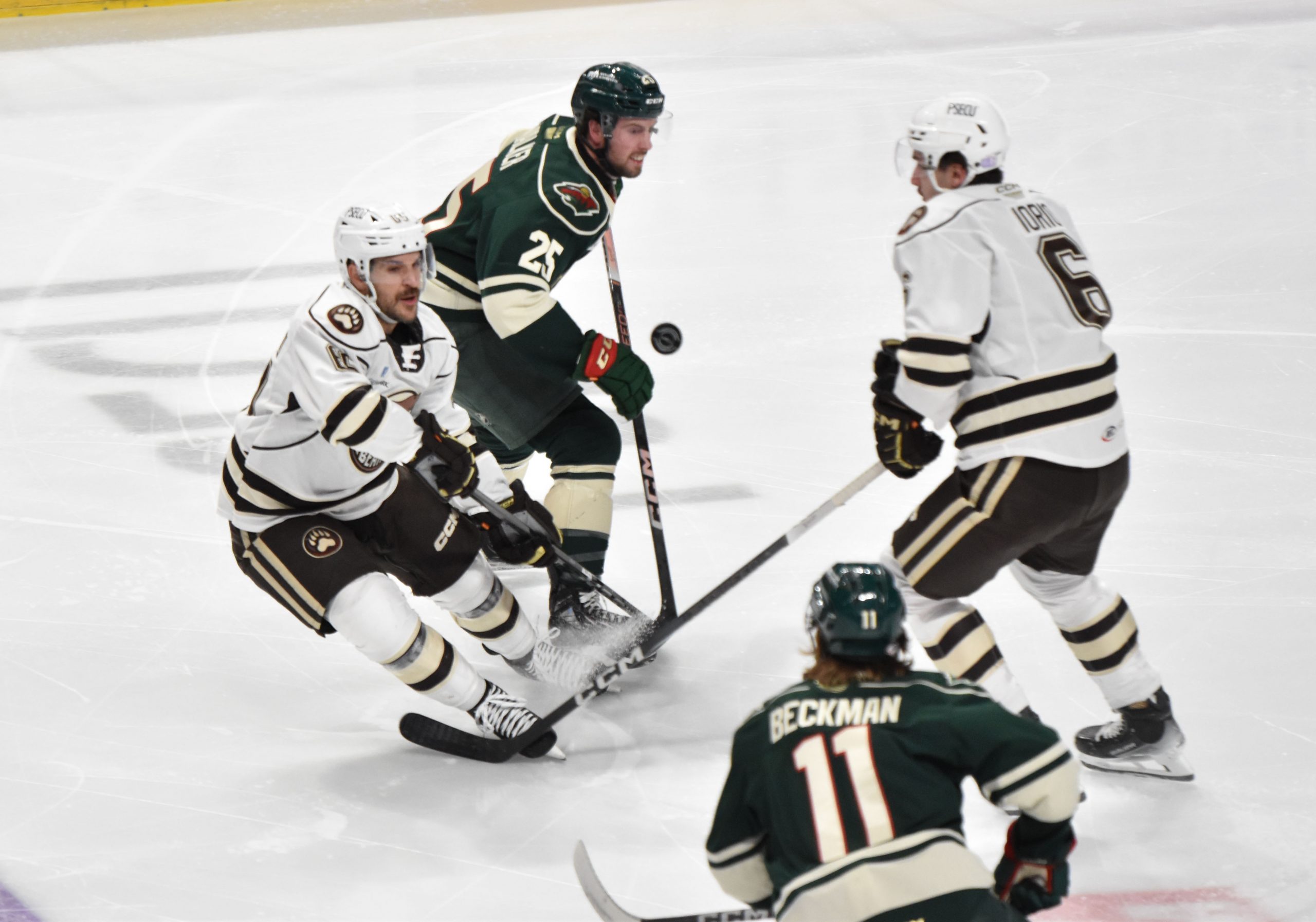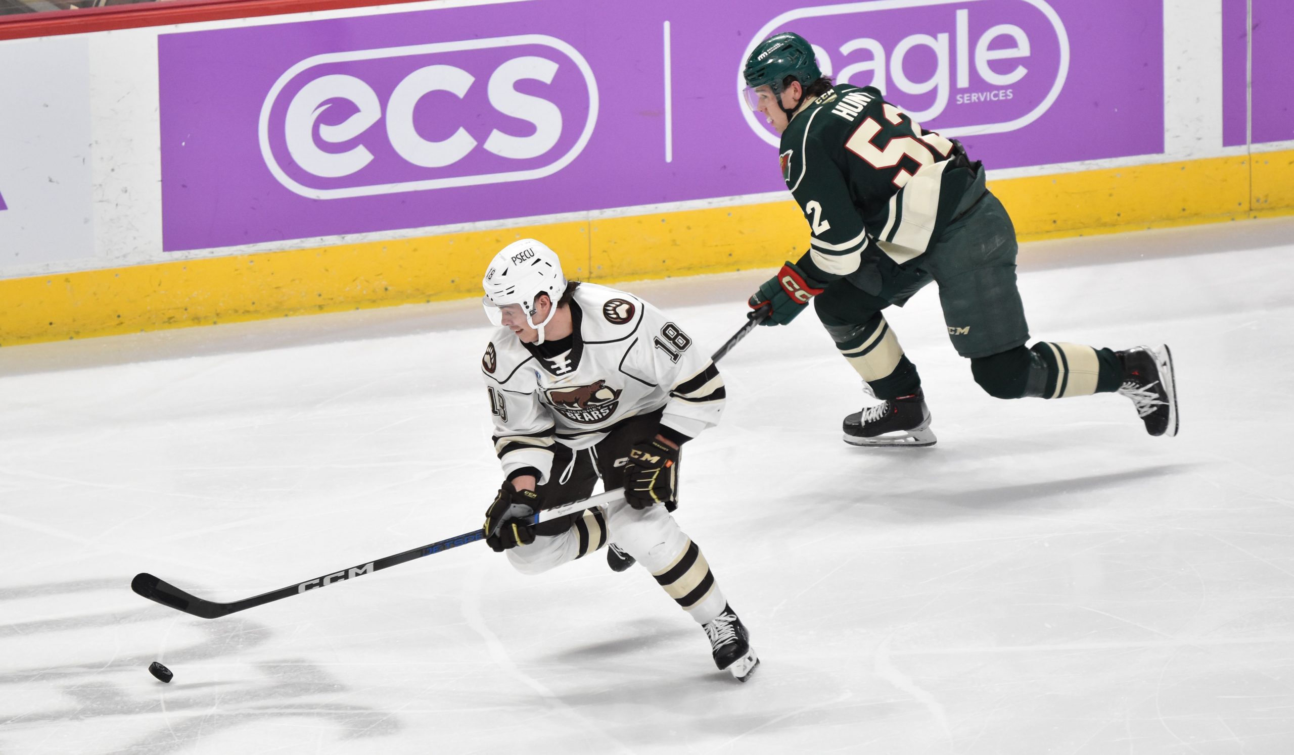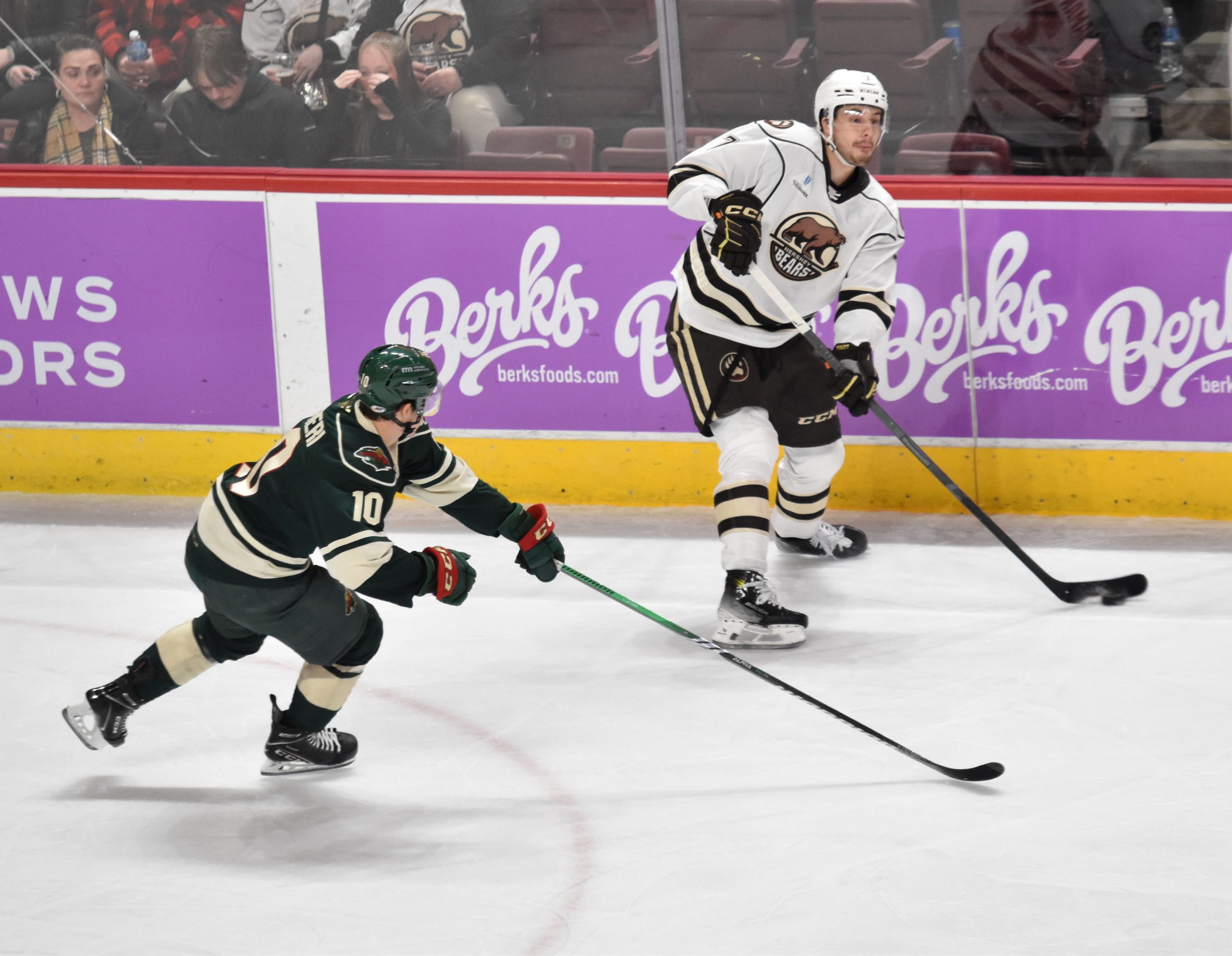 Pierrick Dube broke a 1-1 tie late in regulation to lift the Hershey Bears (14-4-0-0) past the Iowa Wild (6-8-1-1) for a 2-1 win in the first-ever meeting between the two clubs, in front of a crowd of 9,208 on Saturday night at GIANT Center. Hershey reached the quarter-pole mark of the 2023-24 campaign atop the American Hockey League standings, and has now won its last five games.