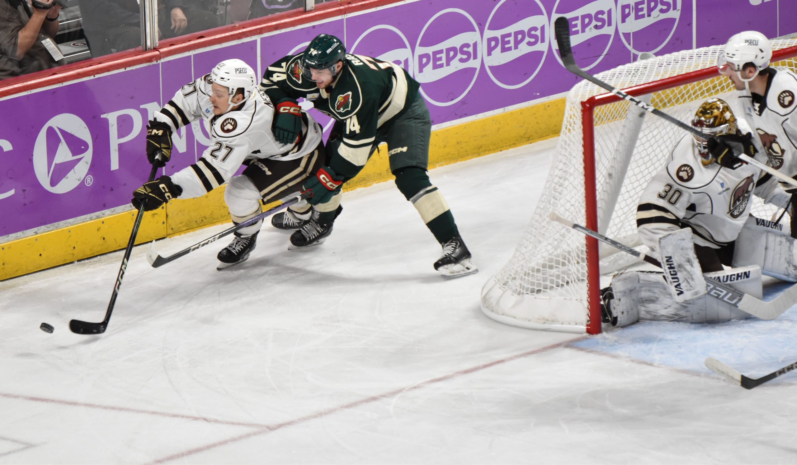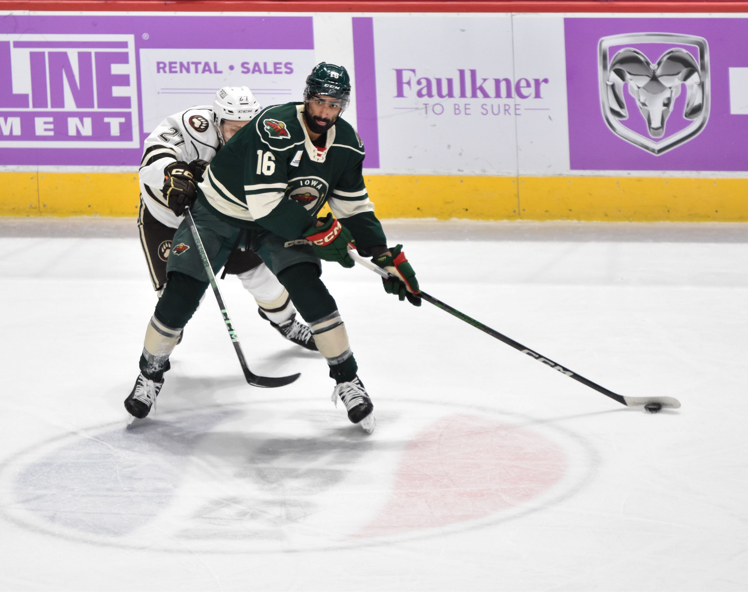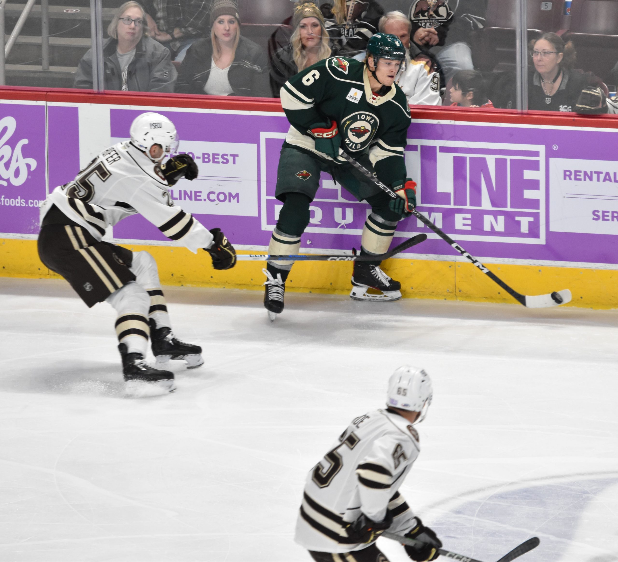 Gavin Hain tied the contest for Iowa with his first pro goal at 19:49 when he gathered Jake Lucchini’s blocked shot in the slot and beat Shepard with a snap shot to the glove side.