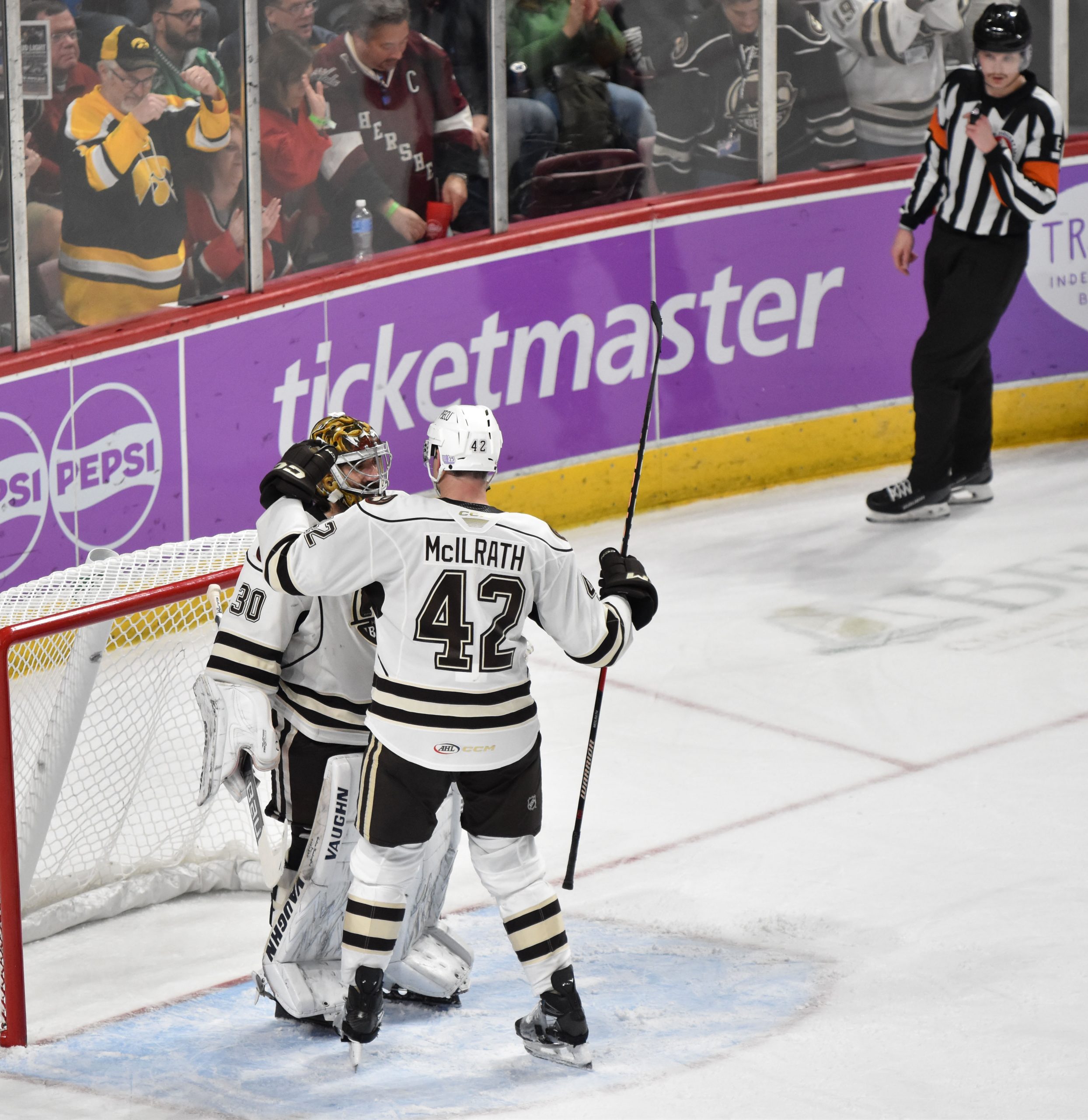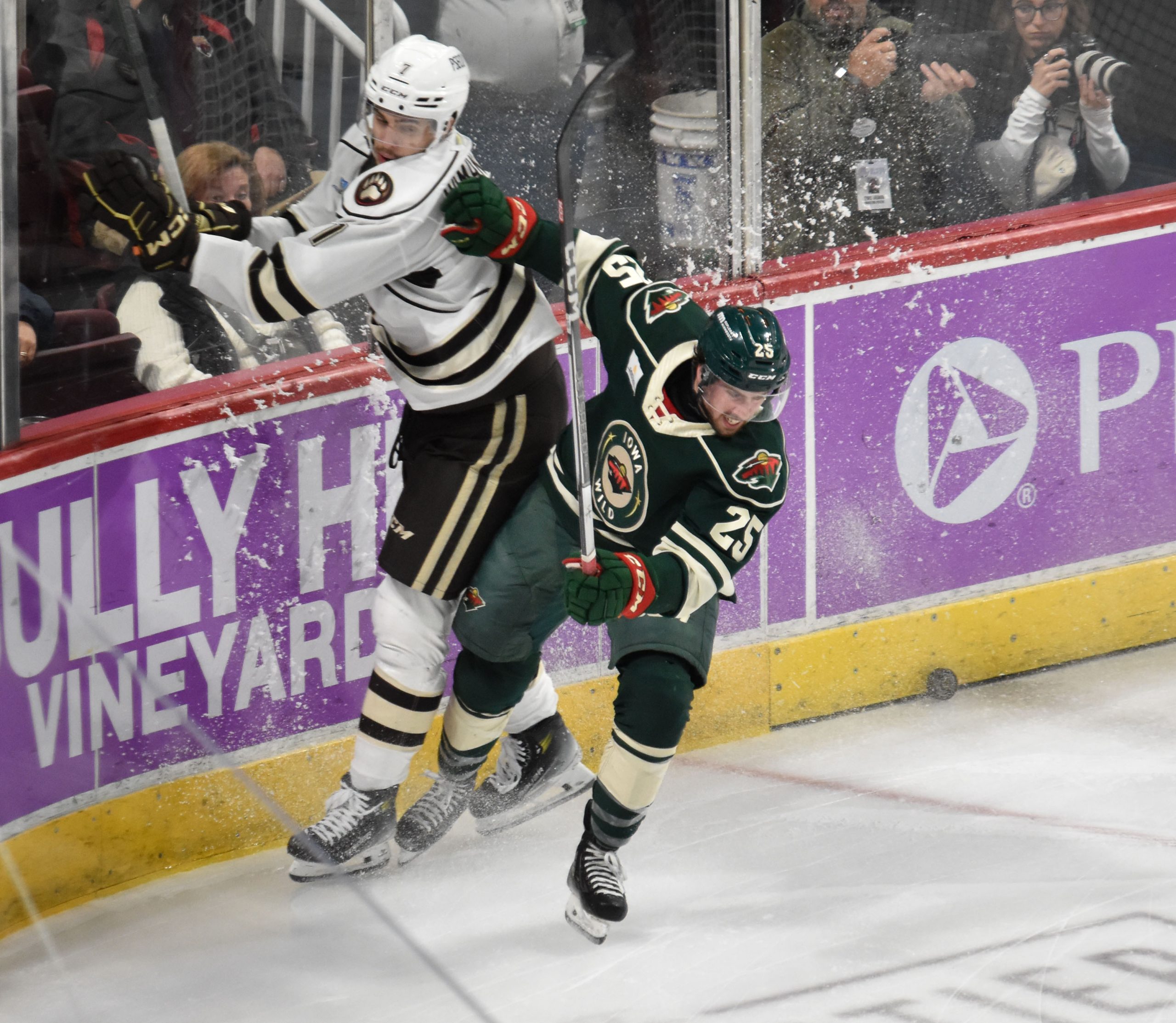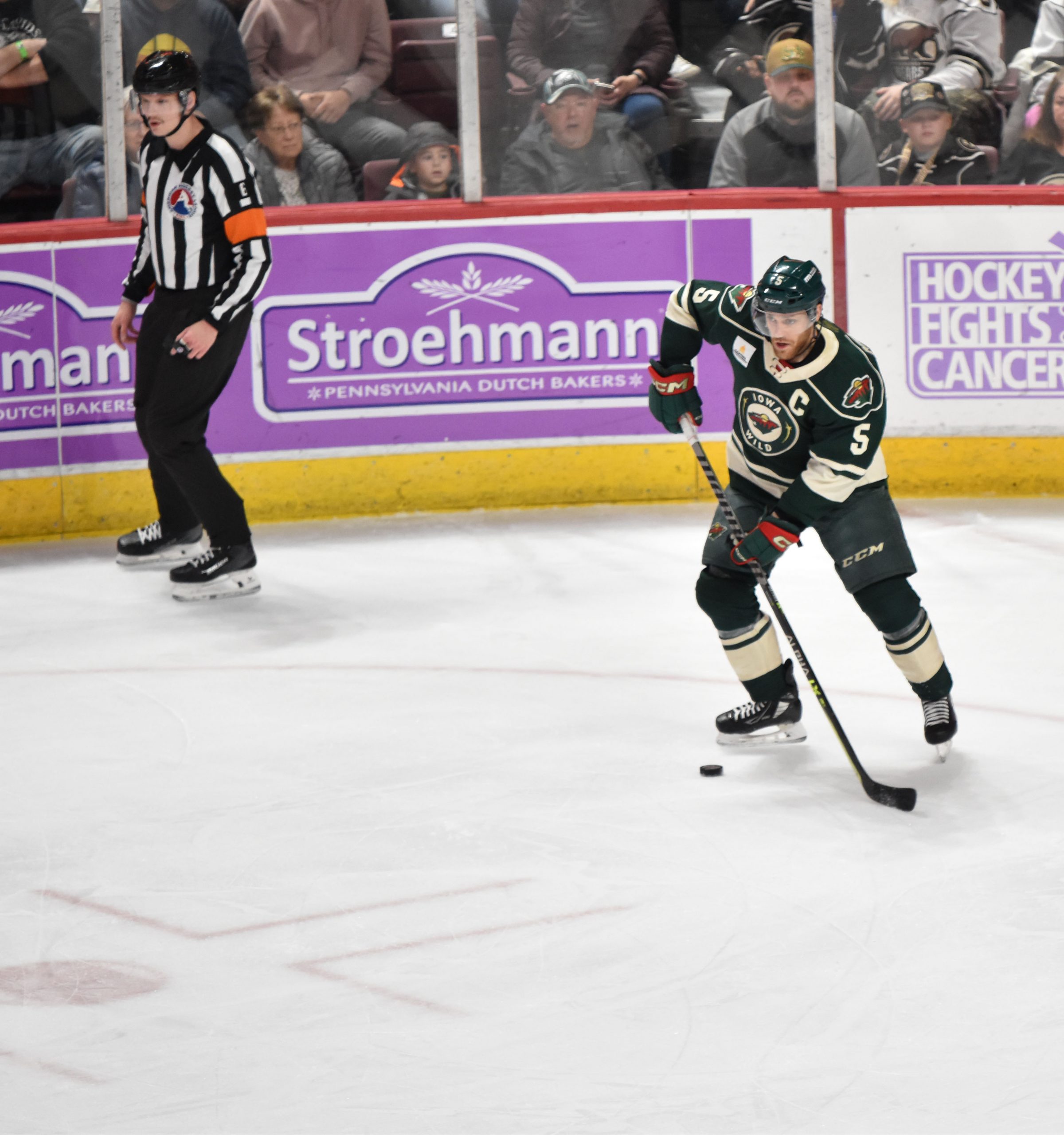 Gavin Hain tied the contest for Iowa with his first pro goal at 19:49 when he gathered Jake Lucchini’s blocked shot in the slot and beat Shepard with a snap shot to the glove side.