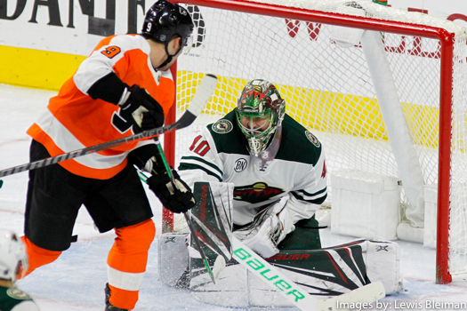 Goalie Devan Dubnyk (#40) of the Minnesota Wild defends the net against Defenseman Ivan Provorov (#9) of the Philadelphia Flyers
