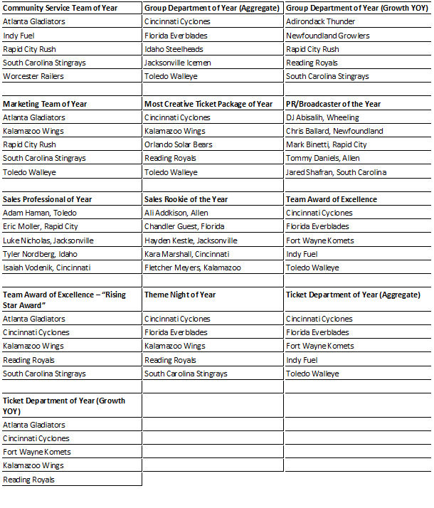 The annual ECHL Team Awards honor teams and individuals in several categories for their accomplishments during the 2019-20 Season. Fans are invited to tune in to see the winners in several team business categories. The awards and nominees are: