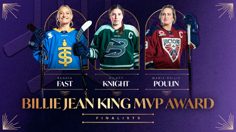 NEW YORK AND TORONTO – The Professional Women’s Hockey League (PWHL) today announced that Renata Fast of the Toronto Sceptres, Hilary Knight of the Boston Fleet, and Marie-Philip Poulin of the Montréal Victoire have been voted as the three finalists for the 2025 PWHL Billie Jean King MVP award.