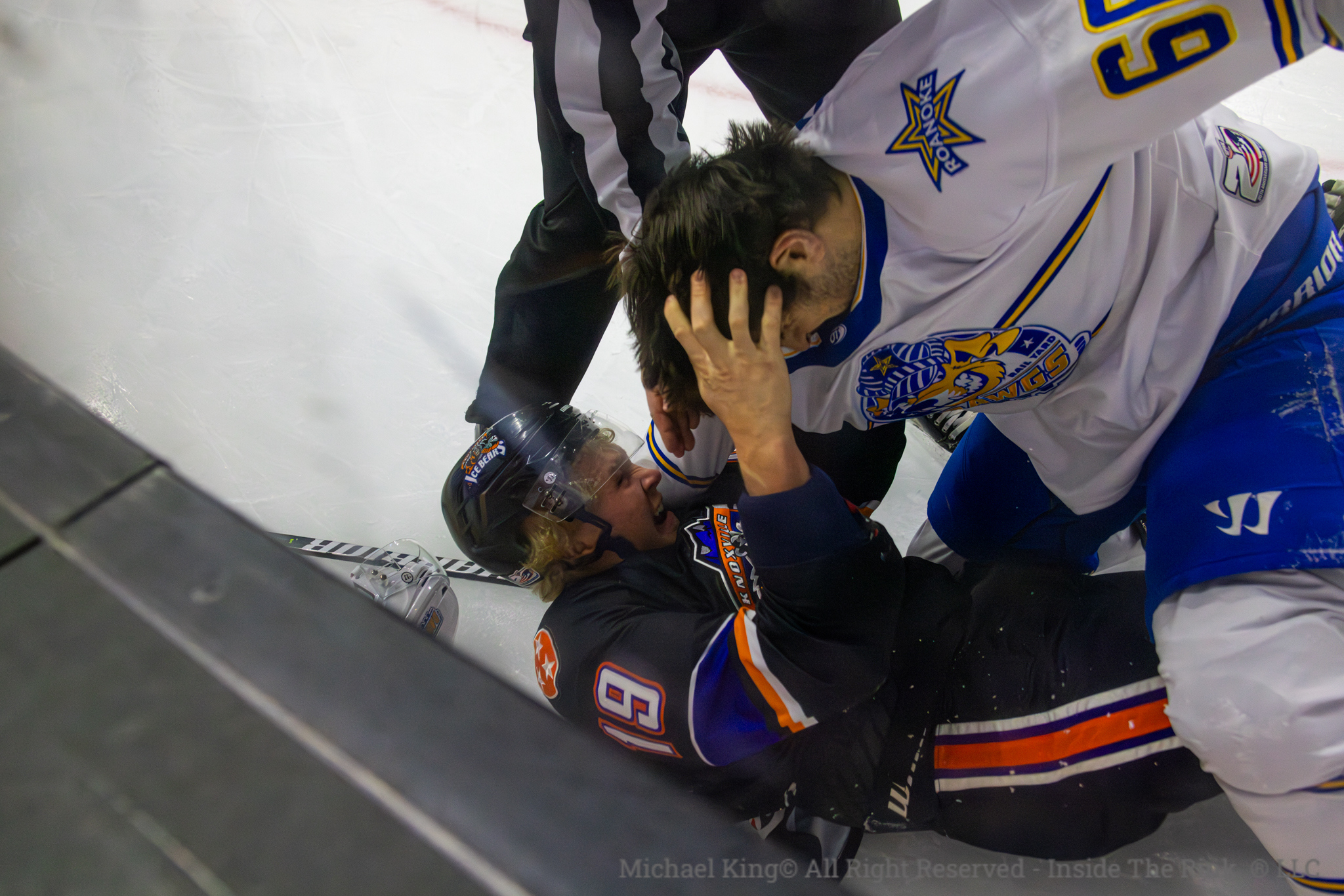 At the forefront of the melee was Roanoke’s Sean Leonard, who was assessed a 3-game suspension. Leonard ignited the fuse in the first period when he dropped gloves with Knoxville’s Dawson McKinney and refused to stop. His suspensions were also a result of an unpenalized slashing incident involving Knoxville’s Justin Portillo. This after Portillo went after Roanoke’s Dominique Marcenkevics on the face-off.