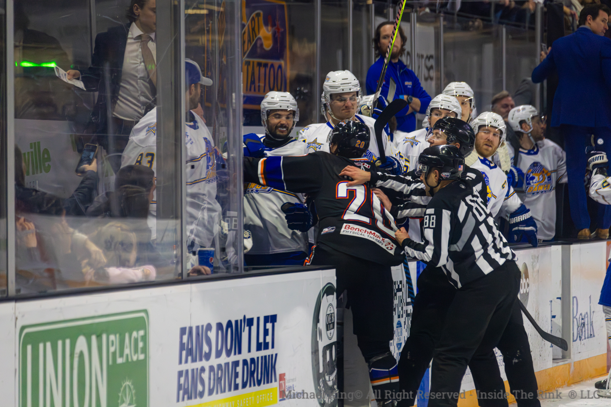 Knoxville’s Cole McKechney incurred a 7-game suspension for a match penalty that involved a cross-check on Marcenkevics at 17:45 into the third, the infraction that incited the brawl of the day.