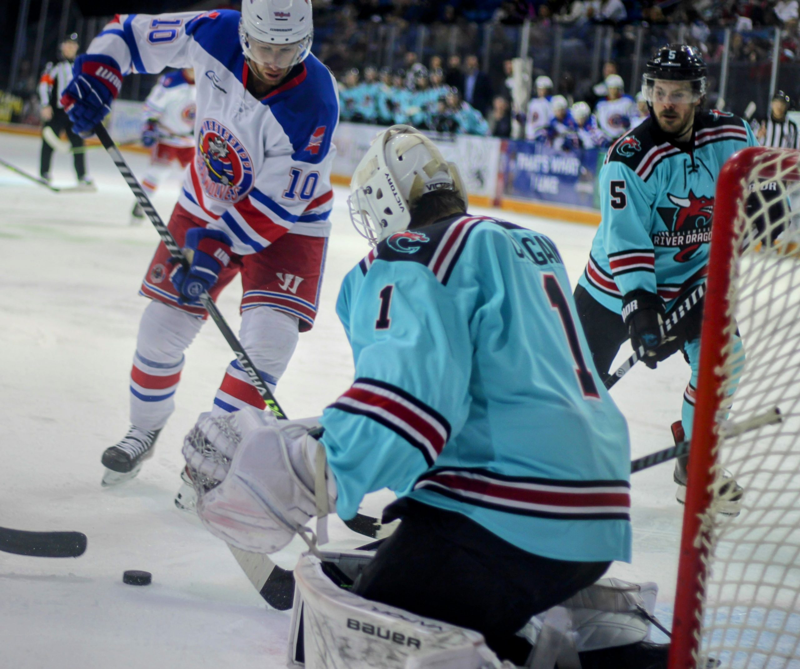 The first period would start off with the dragons’ Jmaeff scoring at the 2:27 mark during a power play. It was quiet till the 9:21 mark when there was some pushing and shoving between players on both sides. There was a confrontation near center ice involving a couple sea wolves’ players and a river dragon player. Pace from the sea wolves would get involved and a penalty before getting ejected. On the way out, he would commit another penalty putting the dragons on a major power play for five minutes. The sea wolves would manage to kill the penalty without letting the dragons add to their lead. The dragons would manage to get another goal at the 16:05 mark with Costello hitting one in off a face-off. This would end the period which was similar to the game prior.