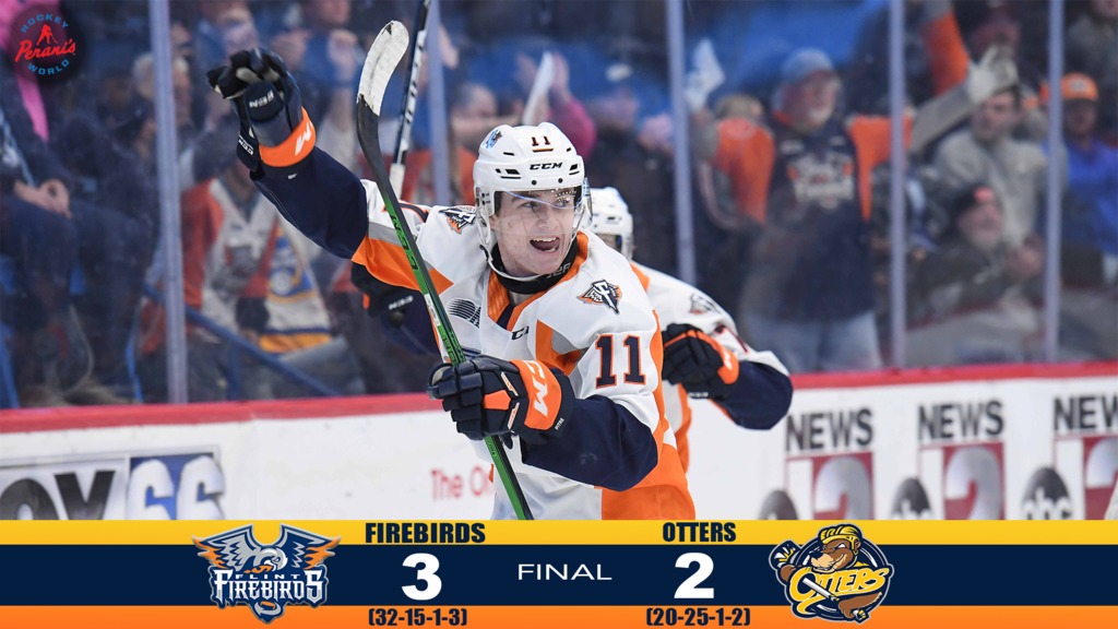 Erie, Penn. – The Firebirds won a game for the history books over the Otters in Erie Saturday night by a final score of 3-2. Ethan Keppen (Vancouver Canucks) scored the first goal in his 200th OHL game, Brennan Othmann (New York Rangers) netted his team-leading 36th, and Coulson Pitre became the franchise’s all-time leader in goals scored by a rookie with his 18th. For the home team, Brendan Sellan potted his 16th and Connor Lockhart scored his second goal in as many games against Flint. The goaltender battle was one of the best of the season, with veteran Luke Cavallin turning aside 37 of 39 shots en-route to his 26th victory of the campaign. First-year netminder Nolan Lalonde had another impressive outing, making 28 saves on 31 shots-faced. With the triumph, this Firebirds crew tied the most win road wins in the regular season in franchise history.
